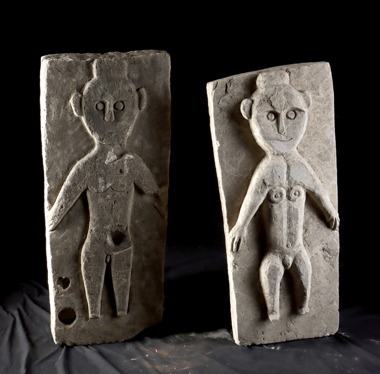 Lot 11a, Auction 3/19/2026: Two Sumatra Stone Figural Plaques – Nude Male & Female