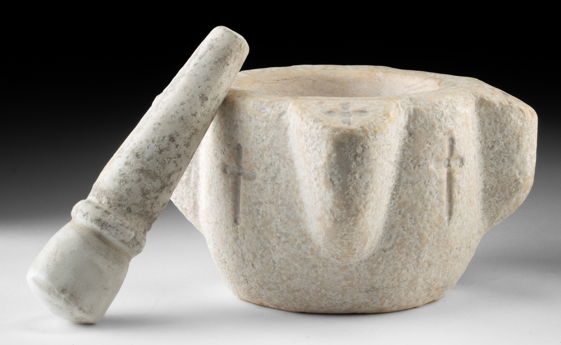 Lot 335, Auction 3/19/2026: 17th C. Spanish Marble Mortar and Pestle with Crosses