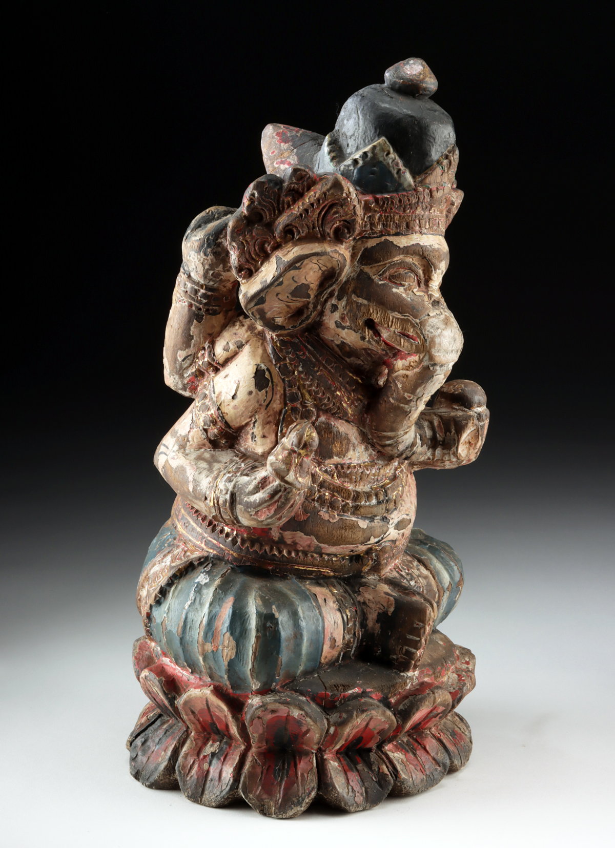 Lot 77, Auction 3/19/2026: Indian Carved Wood Ganesh in Lotus Pose, Four Arms
