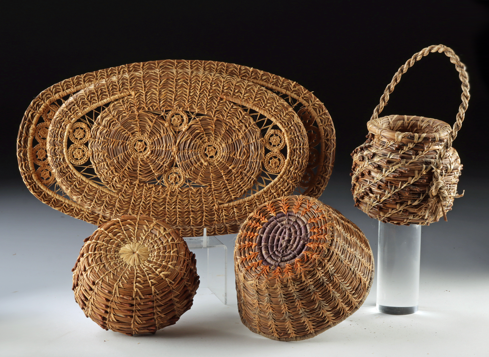 Lot 326, Auction 3/19/2026: 4 American Folk Art Pine Needle & Raffia Woven Baskets
