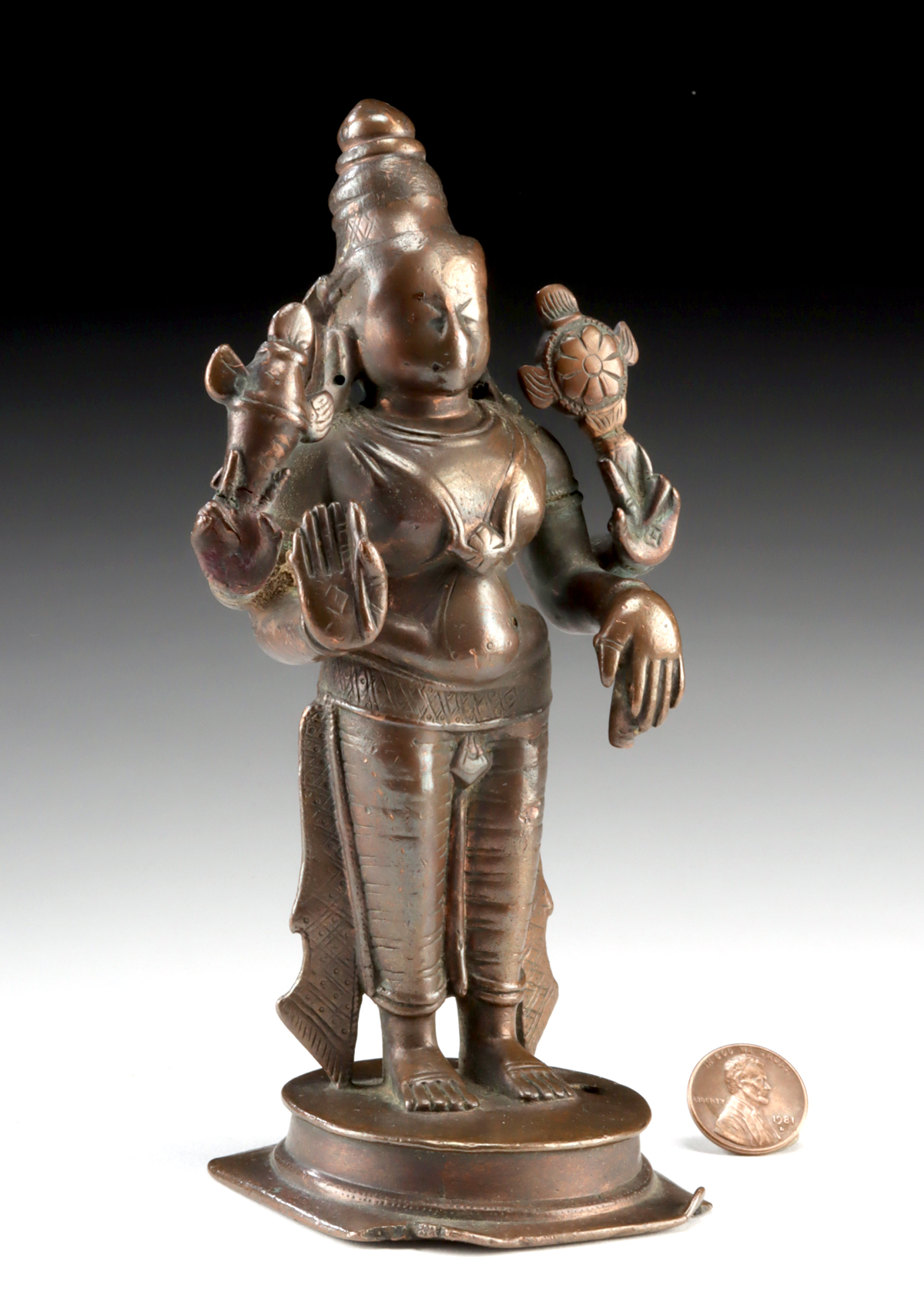 Lot 96, Auction 4/12/2026: 17th C. Indian Copper Vishnu Murti, Heavy Ritual Wear!