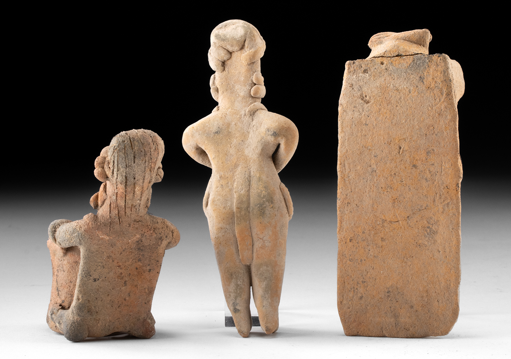 Lot 61, Auction 4/12/2026: 3 Colima Figures – Standing Male, Drummer, Bound Female