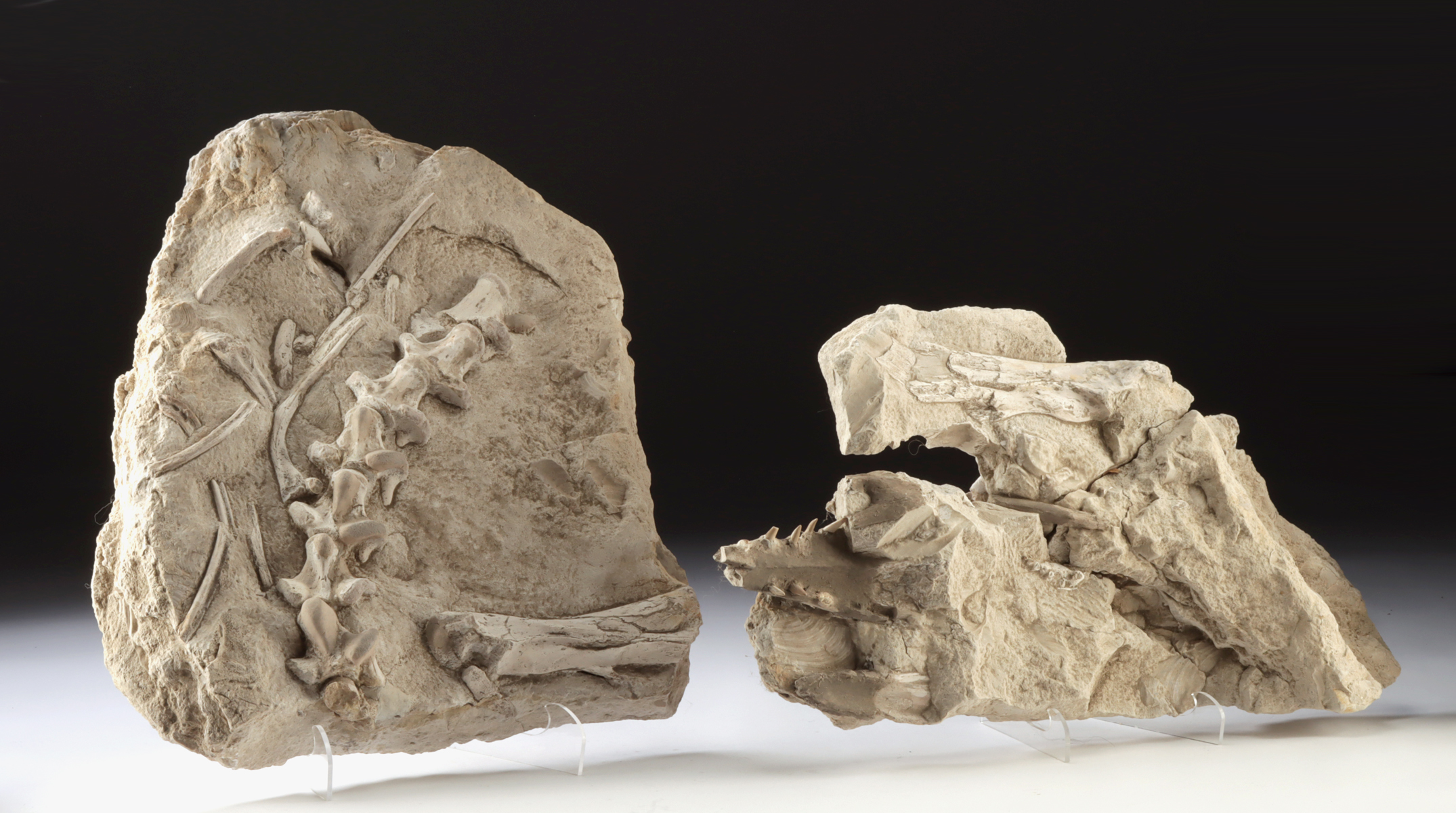 Lot 7, Auction 4/12/2026: 2 Large Mosasaur Fossil Slabs, Vertebrae, Skull & Teeth