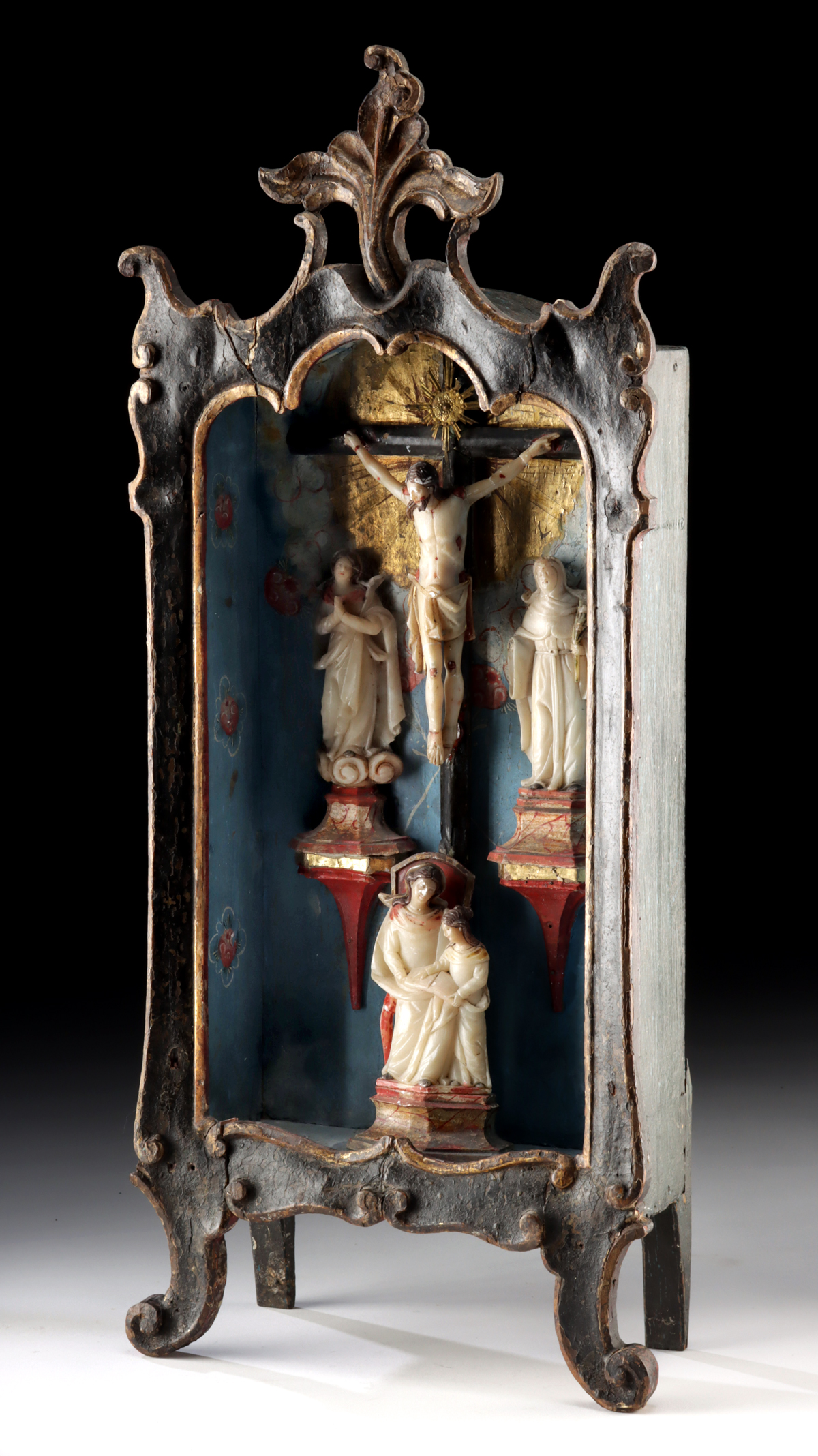 18th C. Brazilian Nicho Crucifixion Tableau & Saints