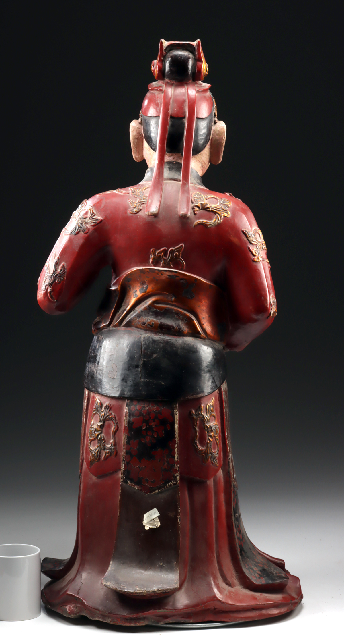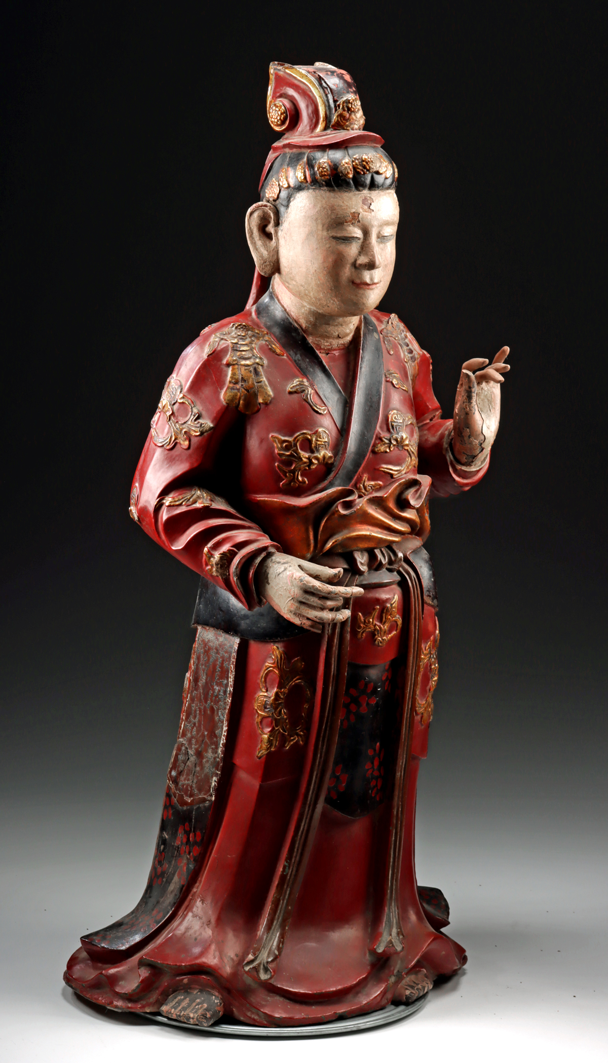 East Asia, China, late Ming Dynasty, ca. 16th to 17th century CE. An impressive and sizable lacquer-and-gilt wood figure of a standing Daoist immortal rises from the artistic traditions of early-modern China, attesting to the enduring power of Daoist devotion at court and in village temples alike. His form – rendered in deep red lacquer burnished by the patina of centuries – is swathed in flowing ritual robes, their movement suggested by soft, cascading folds. Twin sashes descend at either side, their surfaces enlivened with dotted floral patterns, while auspicious emblems are picked out in raised, radiant gold leaf, lending tactile weight to symbols of harmony, longevity, and celestial blessing. Size: 12.5″ L x 16.5″ W x 33.3″ H (31.8 cm x 41.9 cm x 84.6 cm)