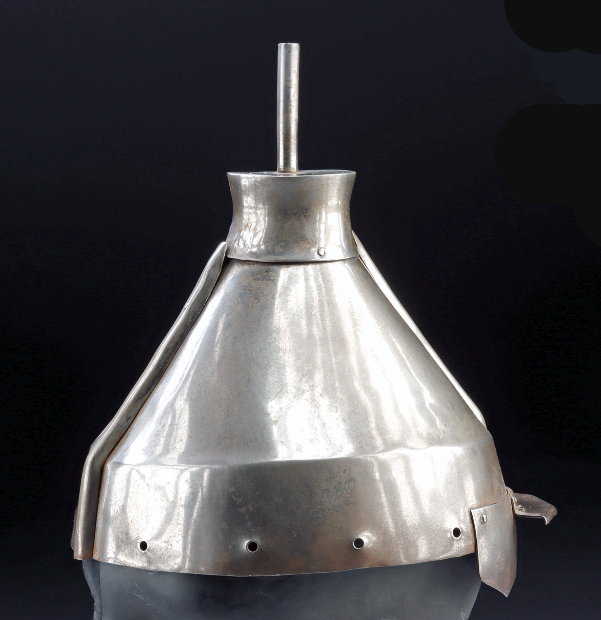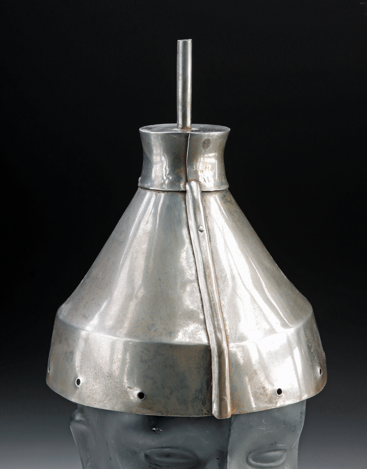 East Asia, China, Qing Dynasty, ca. early 19th century CE. A steel bannerman battle helmet of conical form, assembled from multiple plates secured with rivets and finished with a polished surface. The crown is fitted with a tubular finial intended to hold rank tassels, a feature associated with military dress and identification. A flared brim and projecting visor frame the lower edge, with a line of small rivet holes around the rim for attaching cloth neck flaps. This helmet reflects a style used from the late Ming period onward, with proportions and construction consistent with Qing-era examples. Bannerman status was hereditary within the Eight Banners system. S Size: 8.25″ W x 9.5″ H (21 cm x 24.1 cm)