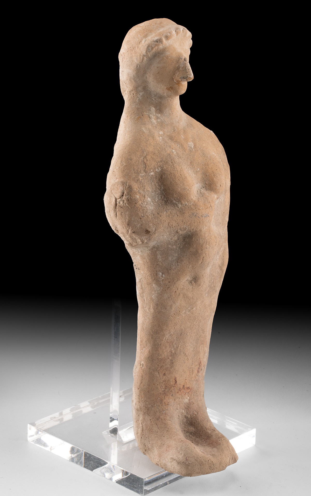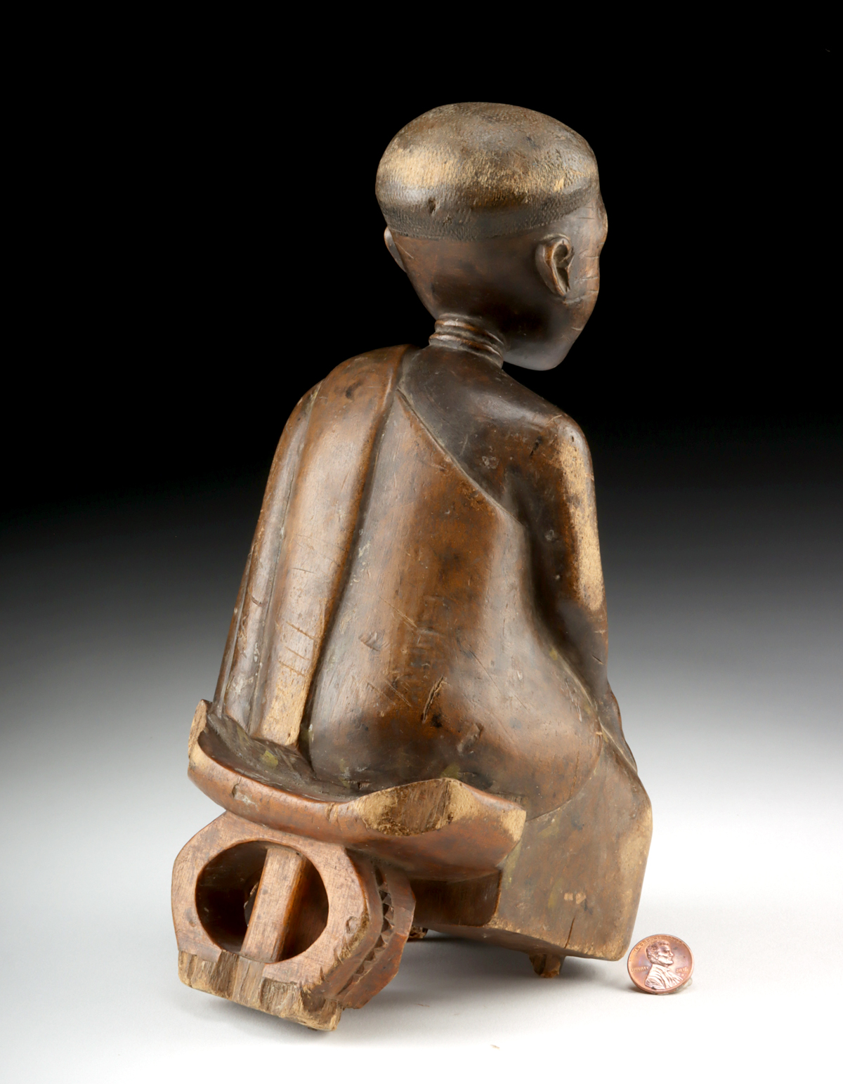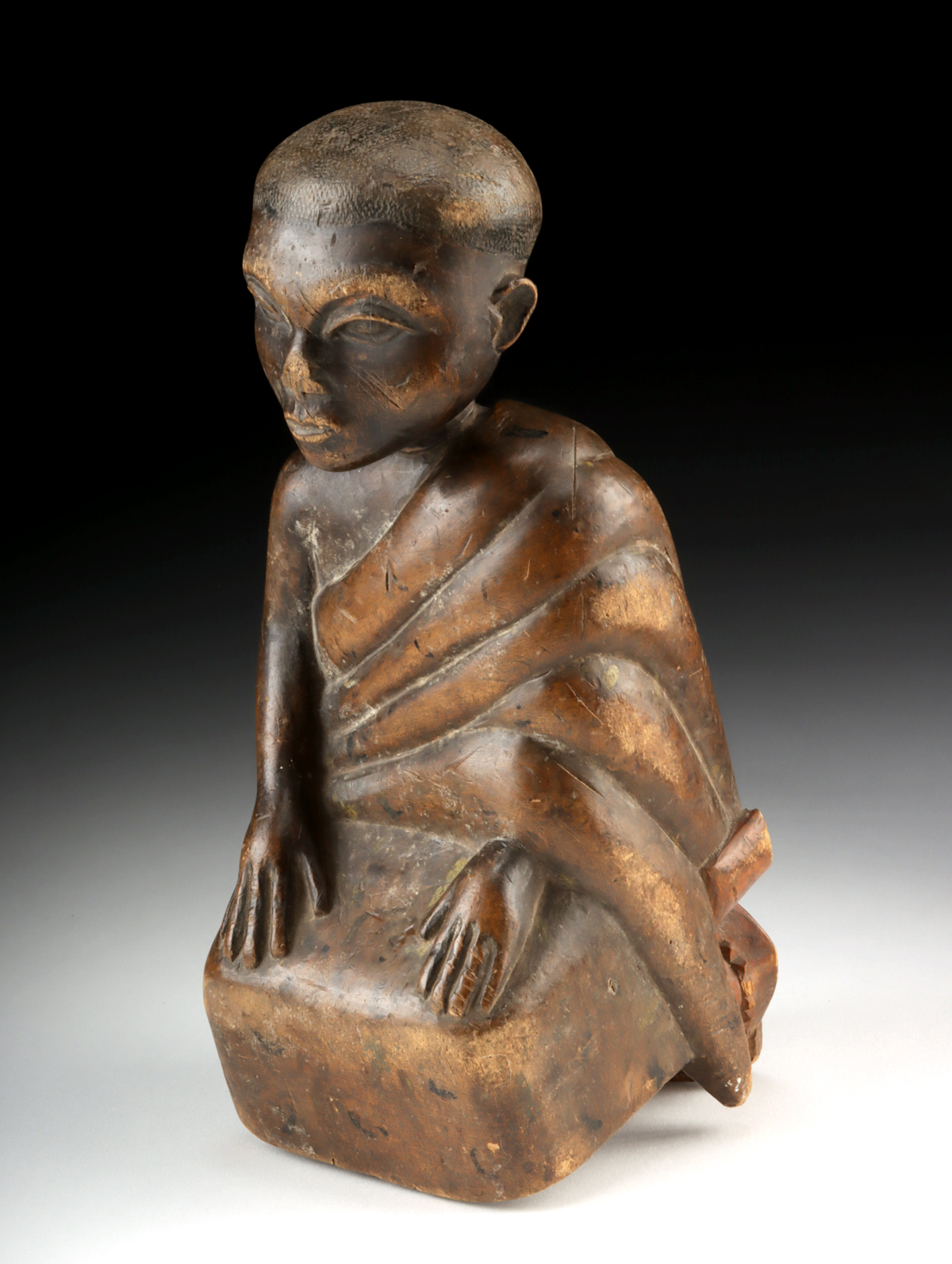 Condition: Losses to the base, and the figure tilts forward -requires support to sit upright. Missing the base of the stool and supports under the knees. Losses to the corners of the seat. Old abrasions, and scratches to the face and arms. Wonderful old patina from handling.