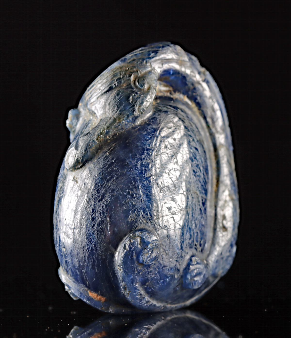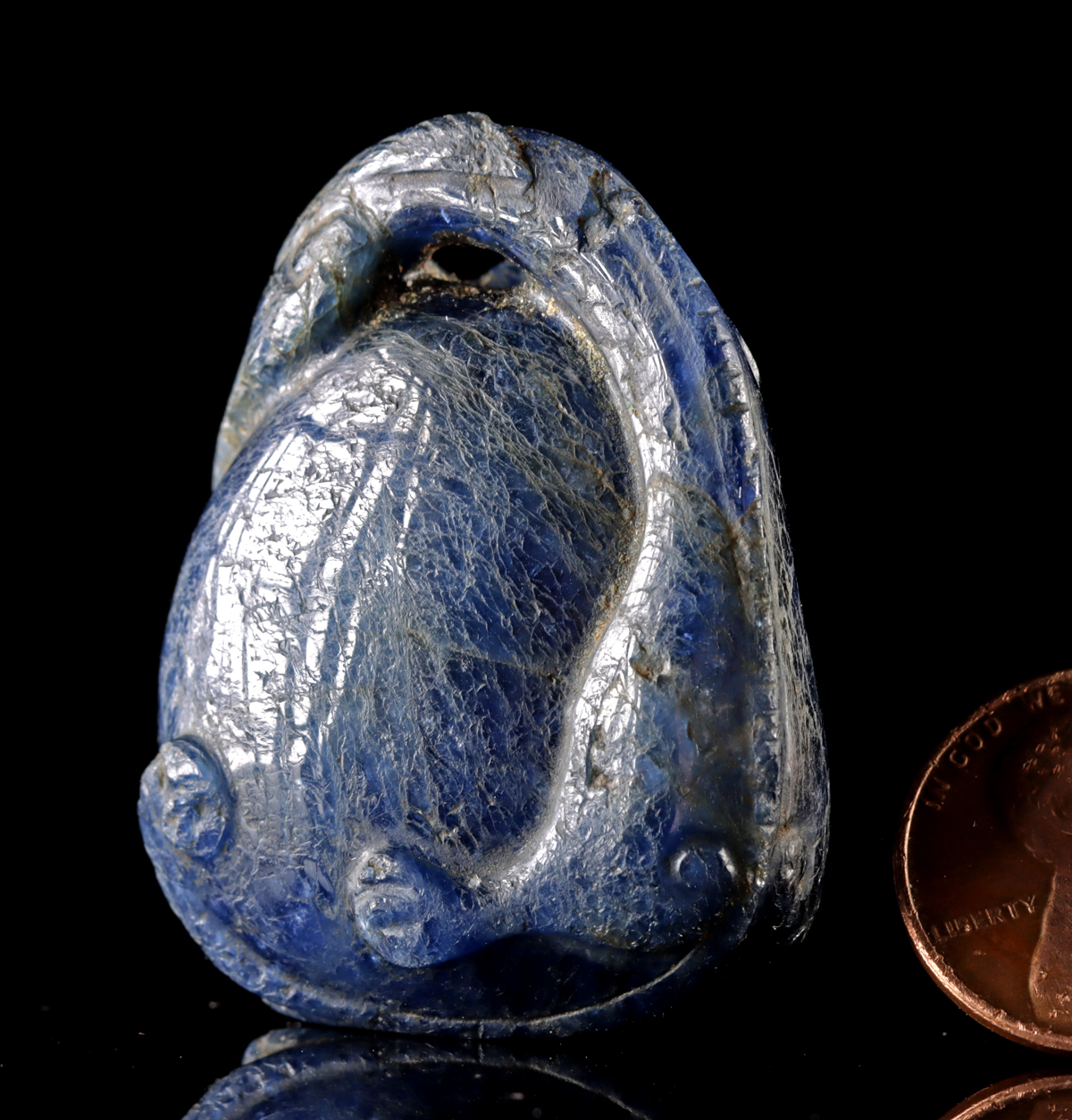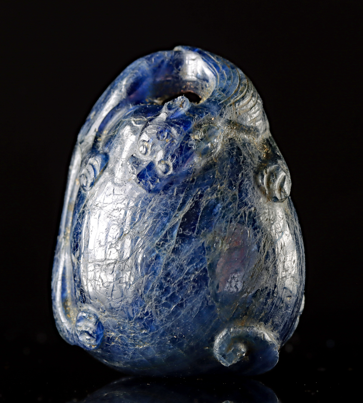 Asia, China, Qing Dynasty, ca. 18th century CE. A captivating and unusually large carved star sapphire pendant, its deep blue surface animated by a feline figure coiled protectively around a rounded form, the composition both intimate and monumental in miniature. The stone, weighing an impressive 54.7 grams (274 carats), is remarkable not only for its scale but for the richness of its color and the subtle internal silk that gives rise to the coveted star effect under light. The feline, likely a stylized cat or mythical beast, is rendered in low relief with softly modeled limbs and a curling tail that arcs across the surface, guiding the eye toward the central mass. Its features are gently defined – rounded ears, a compact muzzle, and tucked limbs – conveying a sense of quiet vigilance. A drilled aperture at the top suggests its function as a pendant, allowing the substantial gemstone to be worn despite its weight. Size of pendant: 1.85″ L x 1.323″ W x 1.588″ H (2.2 cm x 3.4 cm x 4 cm); weight: 54.7 grams (274 carats).