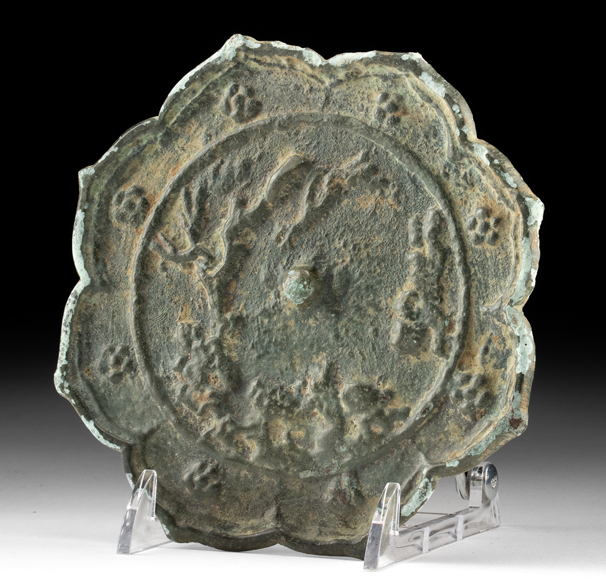 East Asia, China, Tang Dynasty, ca. 618 to 907 CE. A cast leaded bronze mirror of lobed, petal-like form, each of its eight scalloped edges adorned with a petite floral motif. At the center, a raised circular medallion presents a scene scholar stones beneath a tree. The central perforated knob (for stringing the mirror) rises from the middle. The reverse was once highly polished to a reflective sheen, serving as both a practical mirror and grave good. Size: 5.5″ Diameter (14 cm)