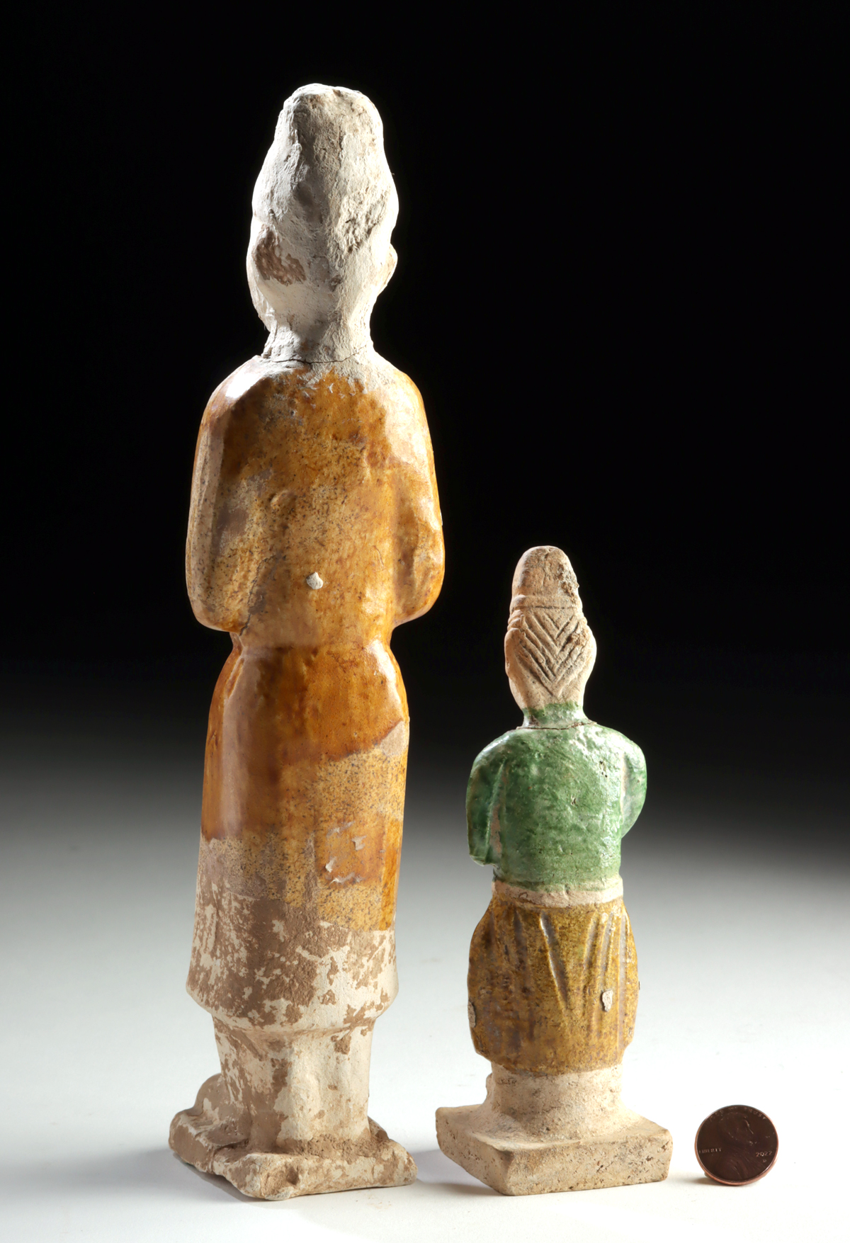 East Asia, China, Tang Dynasty, ca. 618 to 907 CE; Ming Dynasty, ca. 1368 to 1644 CE. A compelling lot of two Chinese glazed pottery attendant figures presents a striking dialogue across centuries, pairing a taller Tang Dynasty figure with a more petite Ming Dynasty counterpart. The larger figure, dating to the Tang Dynasty, stands with solemn composure, hands clasped at the chest in a gesture of respectful attention. Modeled in earthenware and finished with a warm amber glaze, the elongated body and columnar stance reflect Tang funerary sculptures emphasis on presence and dignity. The face is softly rendered with simplified features, while the tall headdress and long robe reinforce the figures formal role within the tomb context. Traces of burial wear and glaze loss contribute to its authentic surface history. In contrast, the smaller Ming Dynasty attendant is more compact in scale and livelier in coloration. Size: 2″ L x 2.5″ W x 9.5″ H (5.1 cm x 6.4 cm x 24.1 cm)