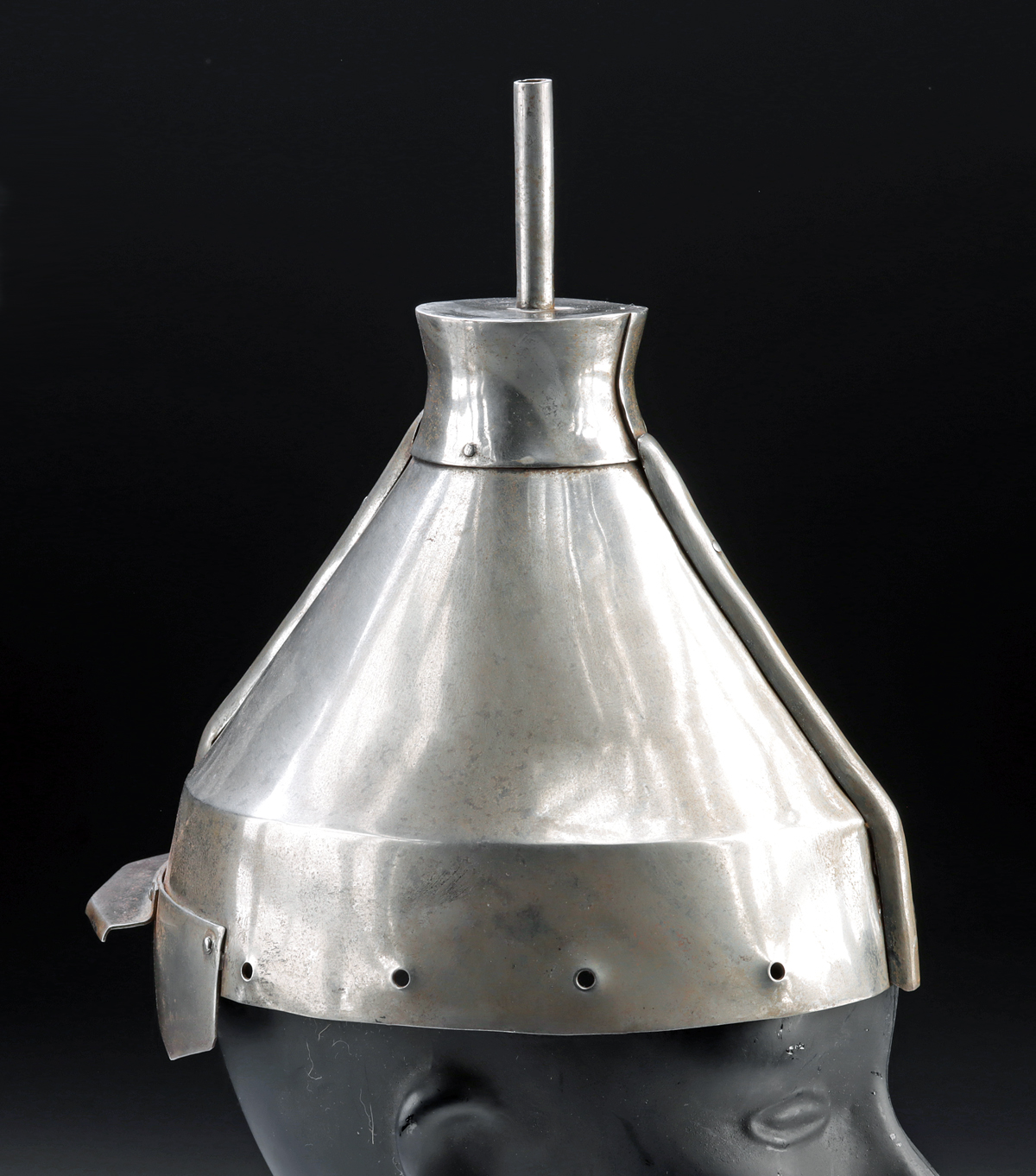 East Asia, China, Qing Dynasty, ca. early 19th century CE. A steel bannerman battle helmet of conical form, assembled from multiple plates secured with rivets and finished with a polished surface. The crown is fitted with a tubular finial intended to hold rank tassels, a feature associated with military dress and identification. A flared brim and projecting visor frame the lower edge, with a line of small rivet holes around the rim for attaching cloth neck flaps. This helmet reflects a style used from the late Ming period onward, with proportions and construction consistent with Qing-era examples. Bannerman status was hereditary within the Eight Banners system. S Size: 8.25″ W x 9.5″ H (21 cm x 24.1 cm)