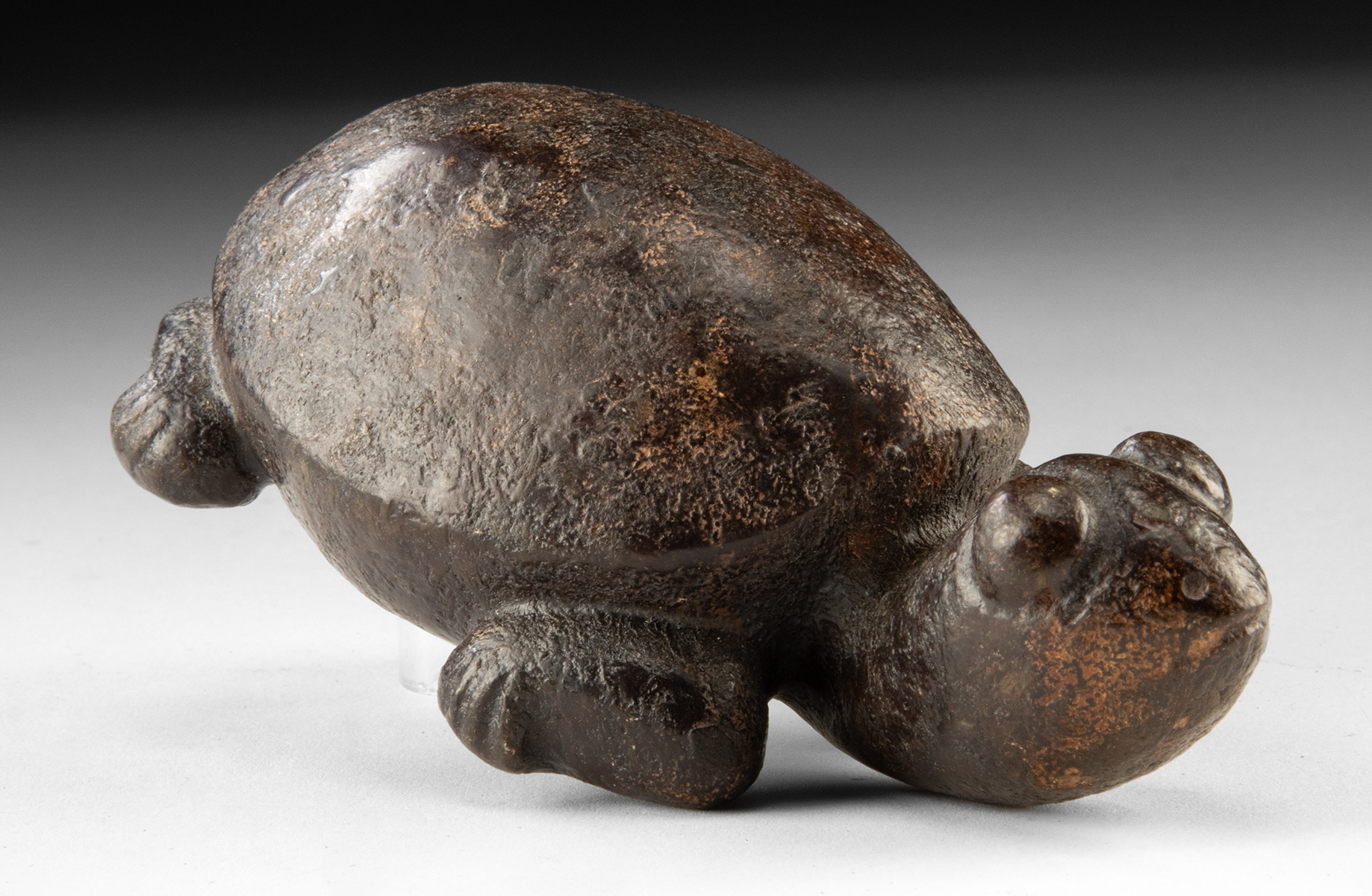 East Asia, China, ca. mid-20th century CE. A carved stone figure of a turtle with rounded shell and simplified head and limbs, worked in dark brown stone with an intentionally aged surface. The form echoes archaic Chinese jade carvings, though the material and finish indicate later manufacture. A decorative carving inspired by early ritual animal forms, the underside is drilled for suspension, but the size and weight make it unsuitable for wearing. Size: 6.5″ L x 3″ W x 2″ H (16.5 cm x 7.6 cm x 5.1 cm)