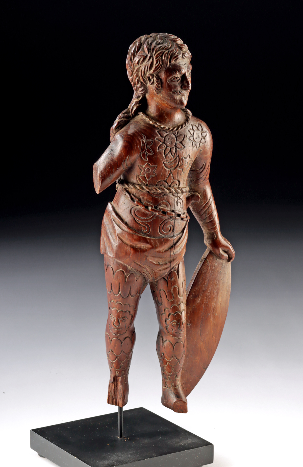 Southeast Asia, Philippines, Visayan Islands, ca. 20th century CE. A boldly carved wood figure of a tattooed warrior, likely representing the legendary chieftain Lapu-Lapu, depicted with stylized floral and geometric body markings, a shield at his side, and a poised, forward stance that evokes both martial readiness and the enduring cultural memory of indigenous resistance. Size: 6″ W x 14.2″ H (15.2 cm x 36.1 cm); 16.2″ H (41.1 cm) on included custom stand.