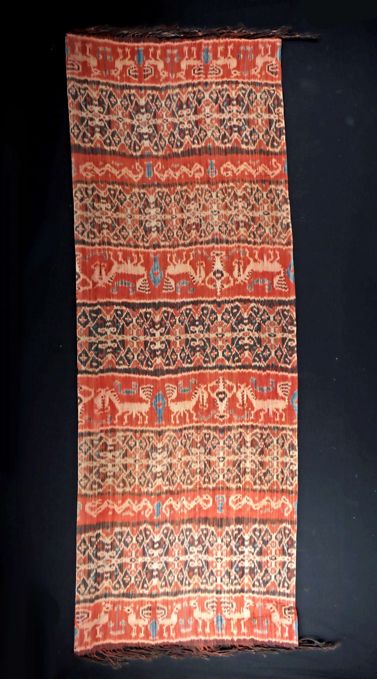 Southeast Asia, Indonesia, Sumba, ca. early to mid-20th century CE. A woven cotton ikat textile, likely used as a hip cloth known as a hinggi, featuring resist-dyed motifs arranged in horizontal bands in earthy tones. Registers of abstract forms and stylized animals create a balanced and graphic composition characteristic of Sumbanese weaving traditions. Size: 110″ L x 33.5″ W (279.4 cm x 85.1 cm)