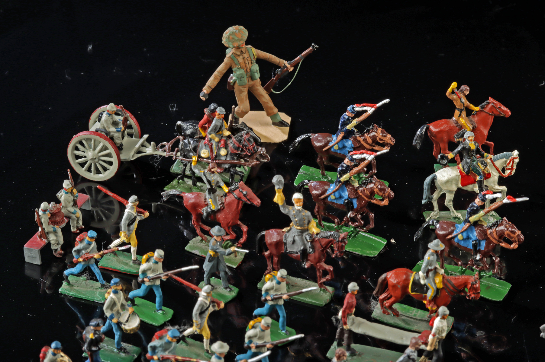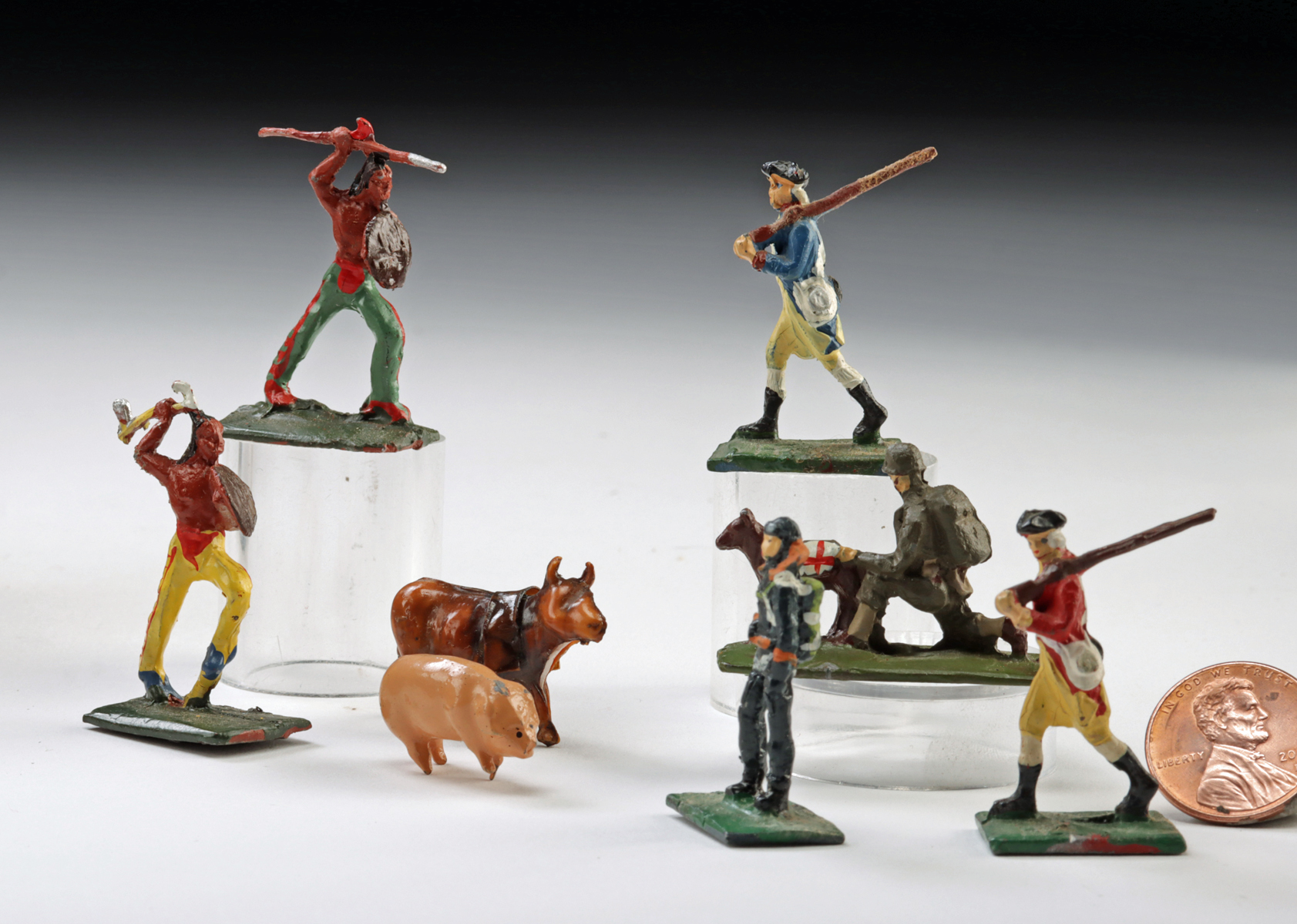 South Africa, ca. mid-20th century CE. An assorted group of forty-nine lead miniature figures in approximately 32 mm scale, depicting Native American warriors, British Red Coat soldiers, American Colonial soldiers, and WWI-era troops including parachutists, accompanied by three small animal figures. Many examples are stamped to the base “UNION OF S. AFRICA,” and were produced by the company Swedish African Engineers (SAE), based in South Africa. Size: 0.5″ W x 1.3″ H (1.3 cm x 3.3 cm)