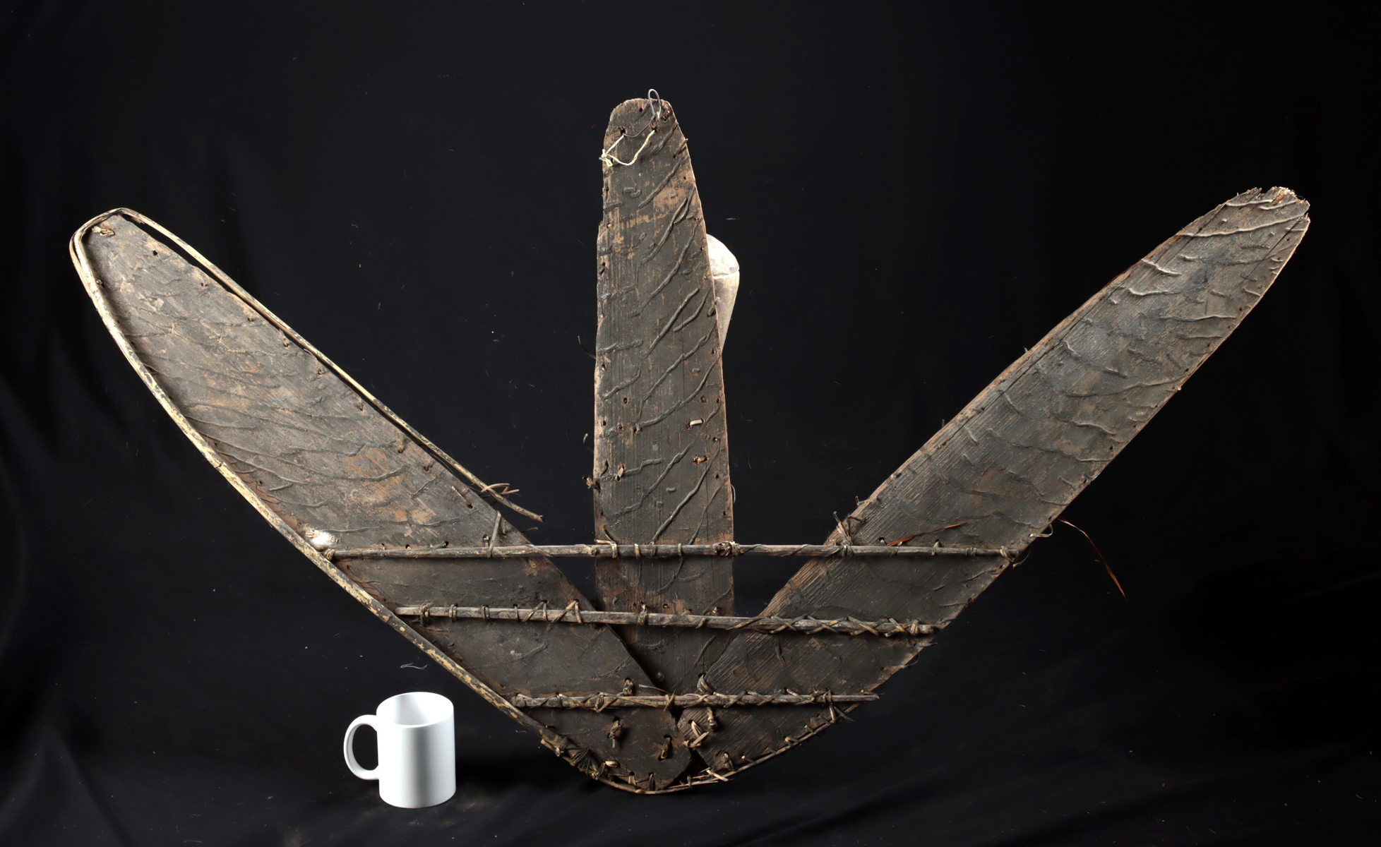 Oceania, Papua New Guinea, Sepik River region, ca. early to mid-20th century CE. A canoe prow ornament shield, hand-carved from wood and painted with natural ochre pigments, featuring a boldly rendered female ancestral figure at the front. Behind the figure rise three large panels formed from fibrous palm spathe, all lashed to a wood and bamboo framework. Such ornaments were mounted on the prows of war canoes, serving both as protective spirit guardians and as vivid visual emblems of clan identity as vessels traveled the waterways of the Sepik region. This example retains much of its original pigment and displays wonderful age and use, embodying the artistry and spiritual traditions of Papua New Guinea. Size: 51″ L x 29″ H (129.5 cm x 73.7 cm)
