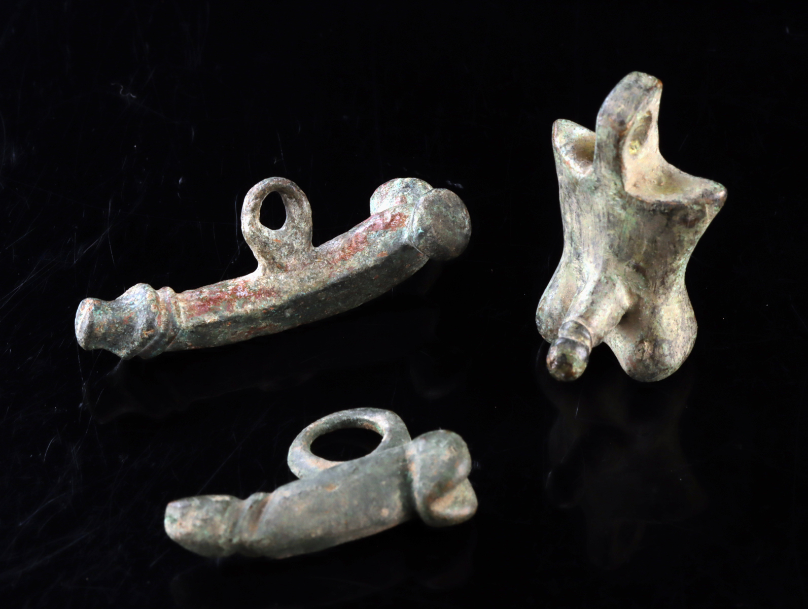Both pieces display age-related patination consistent with ancient bronze and copper-based alloys, their surfaces bearing the mottled green tones typical of long burial. Compact yet symbolically powerful, these amulets reflect a widespread Roman tradition in which humor, superstition, and protective magic were closely intertwined in everyday life.