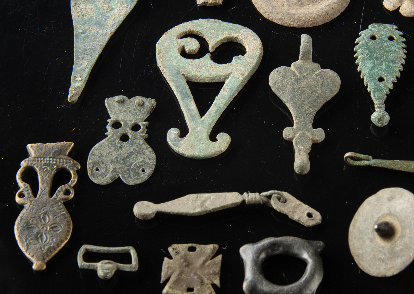 Western Europe, Late Roman & Byzantine to Post Medieval periods, ca. 3rd to 17th century CE. A collection of small bronze, brass, and iron artifacts representing everyday objects and fittings lost or discarded across centuries. The group includes pendants, strap fittings, clasps, hinges, decorative mounts, and a fragment of a small bell, displaying a variety of pierced and openwork forms typical of personal adornment and dress hardware. Surfaces show dark patina and mineral toning consistent with age and exposure to elements, offering an engaging assortment of historical fragments recovered from the European landscape. Size: 3.3″ L x 0.9″ W (8.4 cm x 2.3 cm)
