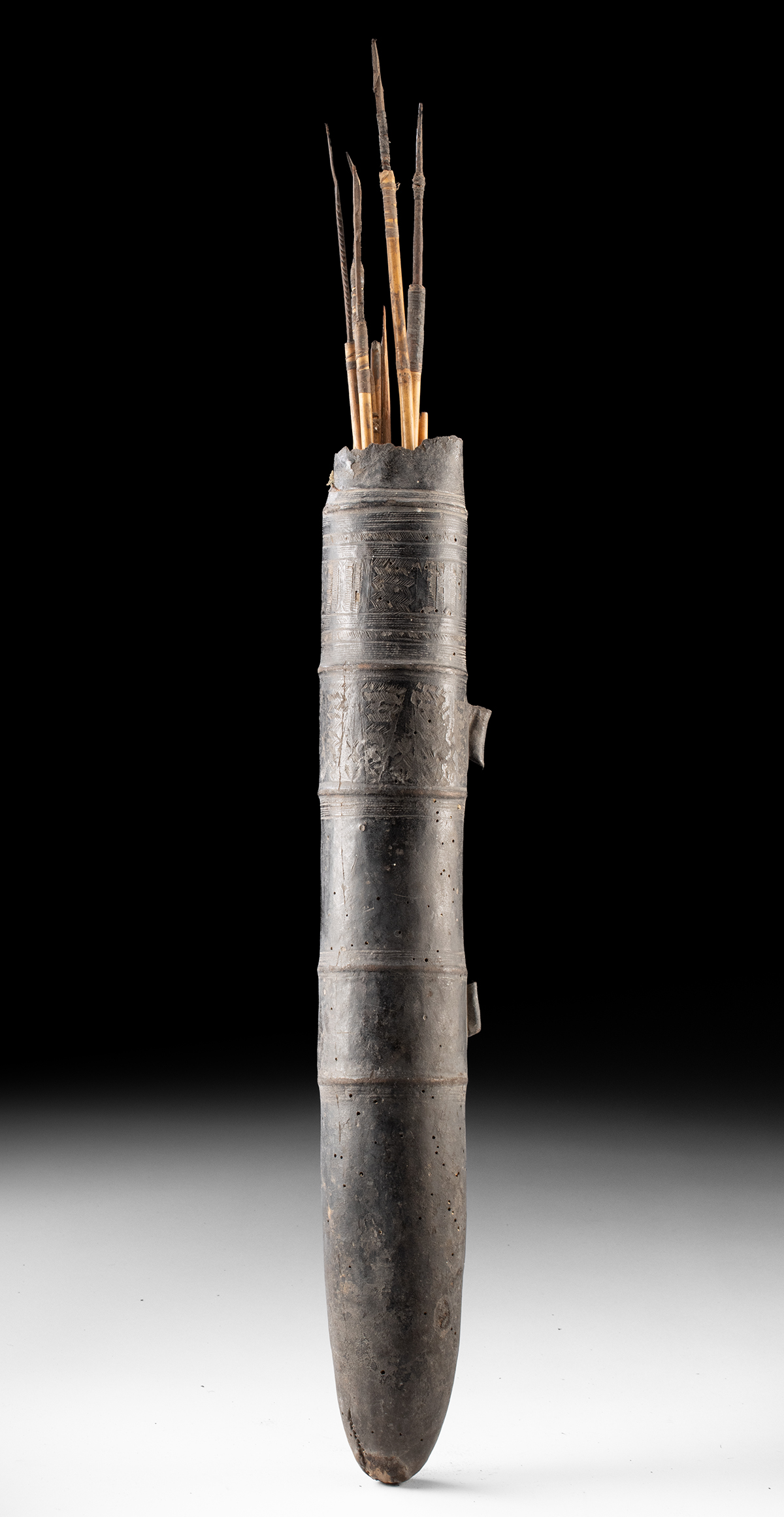 Condition: Chipping and loss to hide at top of quiver. Some perforations and tears to hide in areas. Losses to arrows. Good remains of etched decoration and rich patinas throughout.