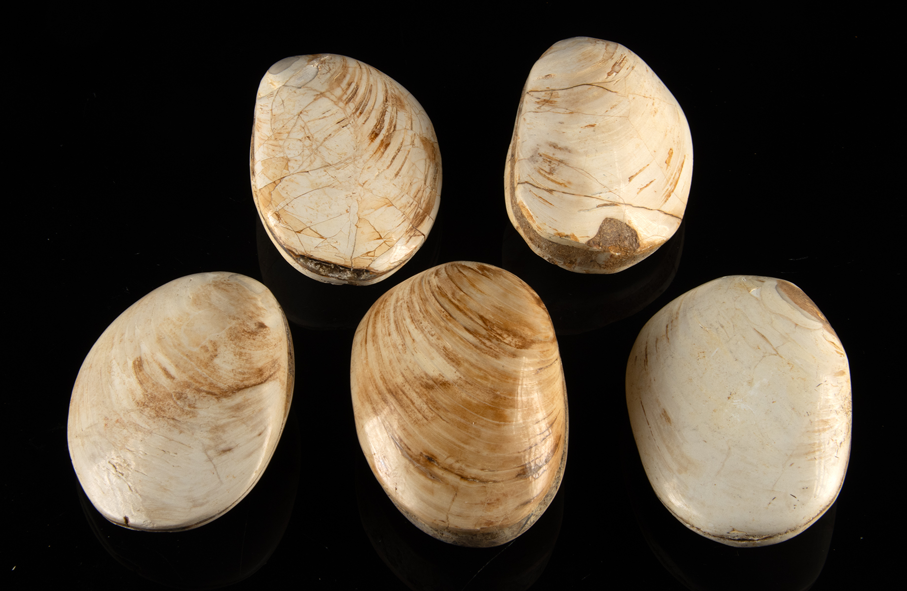 Africa, Madagascar, Late Jurassic, ca. 160 million years ago. This group of five fossil bivalve clams has been carefully polished to reveal smooth surfaces with natural cream tones, warm tan banding, and subtle growth lines. Size: 3″ L x 2″ W (7.6 cm x 5.1 cm)