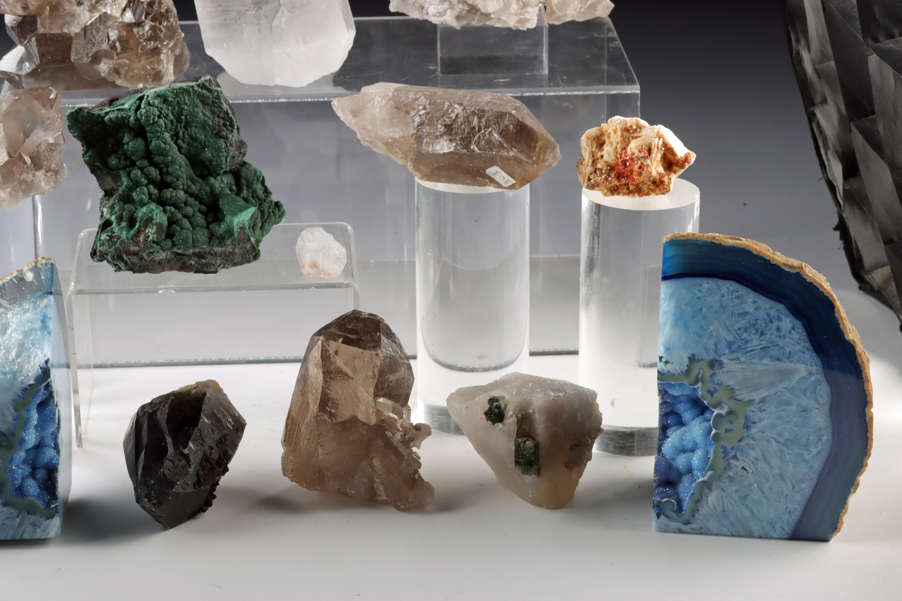 North America, United States; South America, Brazil; Africa, various regions, ca. millions of years ago. A collection of thirteen assorted mineral and crystal formations, primarily quartz varieties including smoky quartz, pale yellow citrine, translucent clear quartz, and deep nearly opaque black specimens, as well as a striking smoky quartz example featuring green and pink tourmaline inclusions and a pair of cut and polished dyed blue agate geode bookends. Complementing the quartz group are a rich green botryoidal malachite formation with a naturally textured surface and a vibrant cluster of rusty orange vanadinite crystals set against white barite, together forming a diverse and visually compelling mineral assemblage. Size of a book end: 3″ L x 3″ W x 5″ H (7.6 cm x 7.6 cm x 12.7 cm)