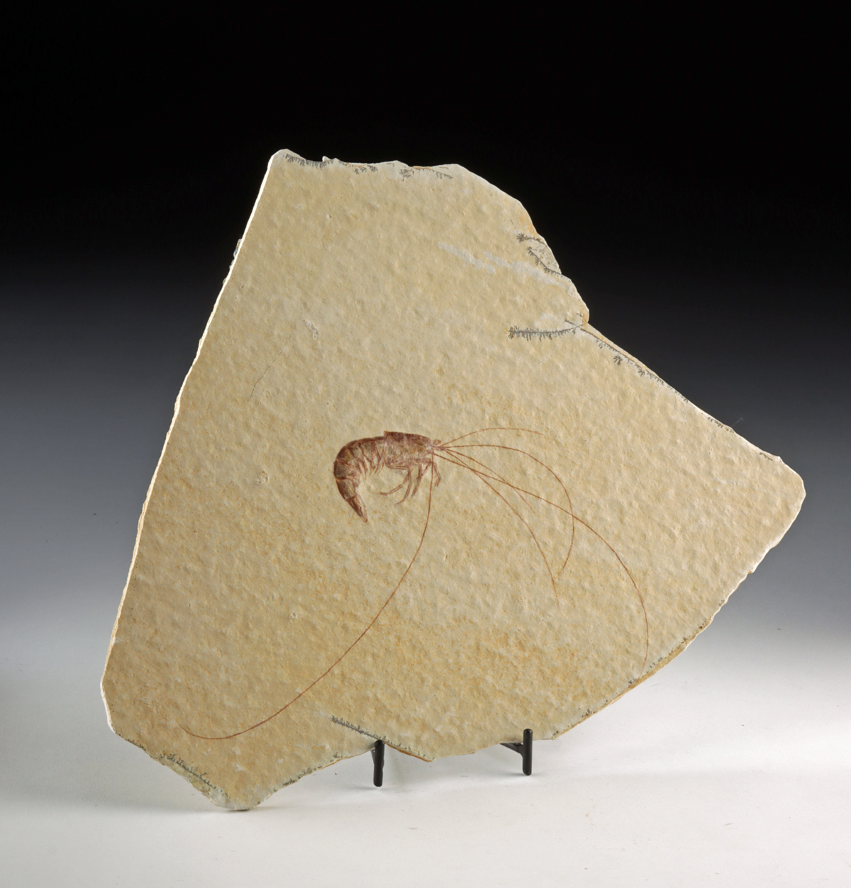 Western Europe, Germany, Eichstatt, Solnhofen (Altmuhltal) Formation, Jurassic Period, ca. 154 to 144 million years ago. A fossil prawn of the genus Antrimpos preserved on a natural limestone slab from the renowned Solnhofen quarries. The specimen displays a well-defined carapace, segmented abdomen, articulated legs, and elongated antennae extending gracefully across the matrix. The appendages and antennae have been lightly enhanced with subtle pigment to improve visual clarity while remaining faithful to the underlying fossil impressions. The warm beige limestone provides a clean field that highlights the delicate structure of this Jurassic crustacean, a classic example of Solnhofen’s exceptional preservation. Size: 11.75″ L x 9.5″ W (29.8 cm x 24.1 cm); 8.5″ H (21.6 cm) on included custom stand.