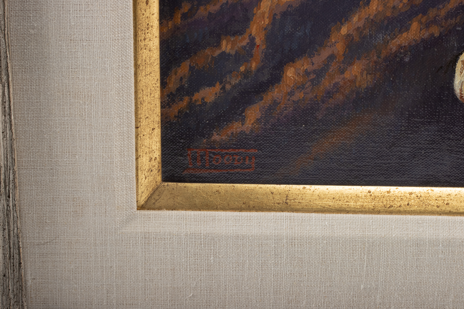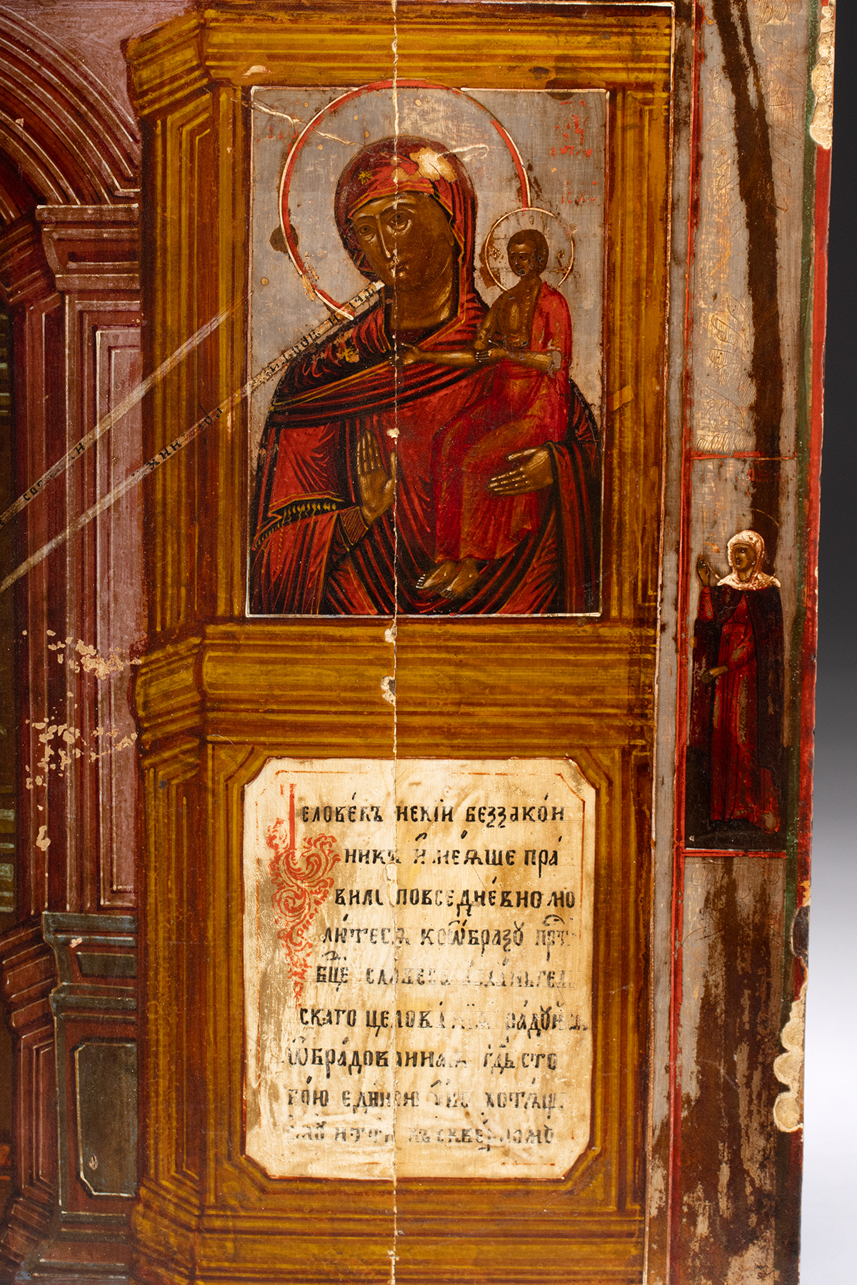 Condition: Mounted behind glass in custom wooden frame; has not been examined outside of glass. Fragment of a funic with losses, perforations, tears, and pulling as shown. Discoloring to fabric in areas. Clear imagery with good remaining pigments. Suspension wire on verso of frame for display.