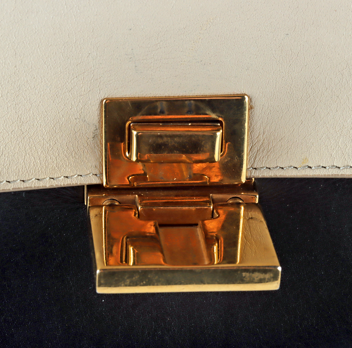Crafted in Italy in 2014, the design pairs smooth black leather with a beige flap and soft tan suede side panels of calf hair, creating a subtle contrast of tone and texture. The structured silhouette is defined by its signature flared “winged” sides, a hallmark of the Trapeze line, which gives the bag its sculptural form and effortless sophistication. The front flap secures with a square gold-toned push-lock clasp engraved with the Celine logo, opening to reveal a spacious interior lined in supple leather and fitted with a front zip pocket for organization. A top handle offers a refined hand-held option, while the long leather strap – fully detachable – adds versatility for shoulder or crossbody wear. Size: 17″ L x 6″ W x 8.25″ H (43.2 cm x 15.2 cm x 21 cm)