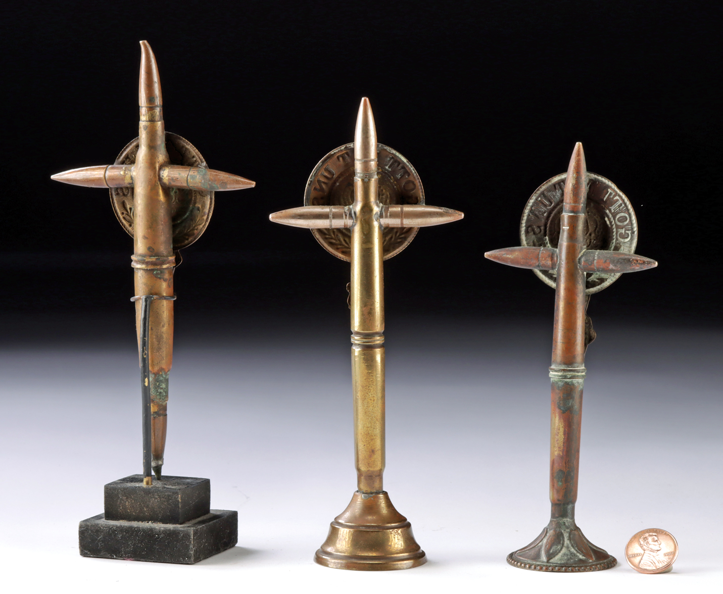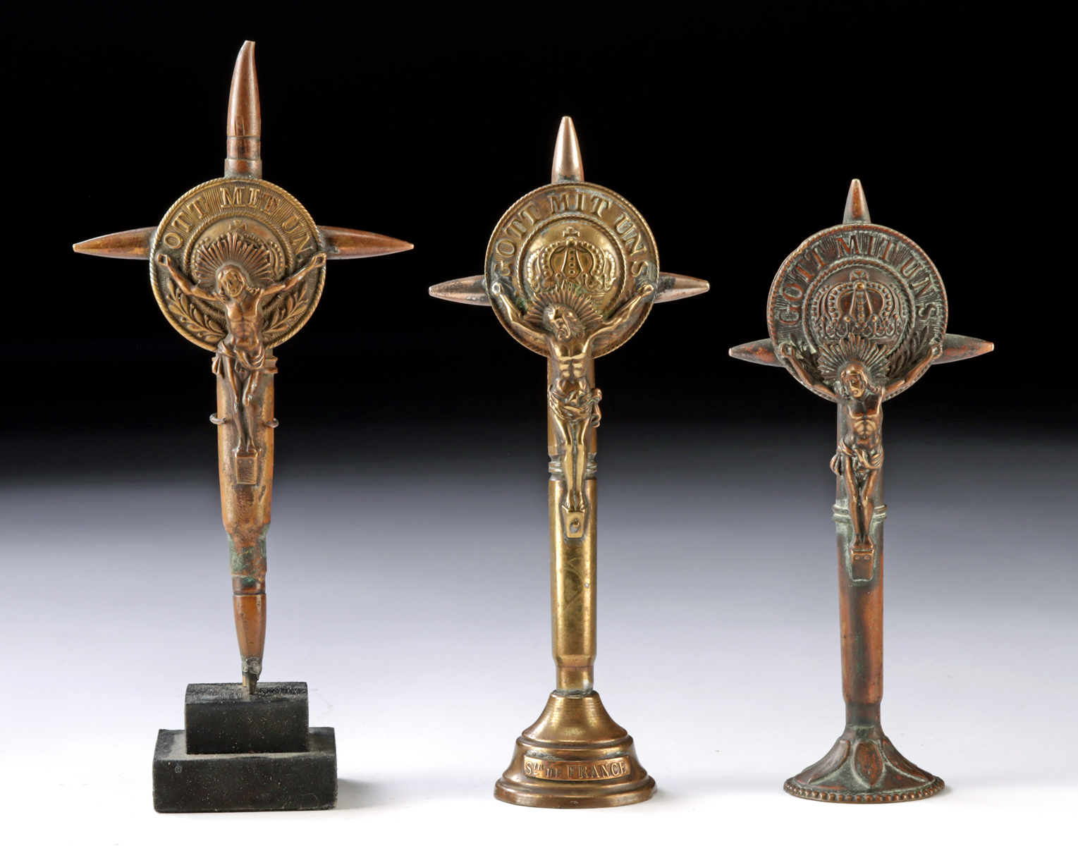Europe, World War I period, ca. 1914 to 1918 CE. A poignant set of three trench art crucifixes, each ingeniously fashioned from spent brass bullet casings and centered with a circular plaque repurposed from a German military belt buckle inscribed “GOTT MIT UNS” (“God with us”), with cast figures of Christ affixed to the vertical shafts. Size of largest: 3.3″ W x 6.4″ H (8.4 cm x 16.3 cm); 7.4″ H (18.8 cm) on included custom stand.