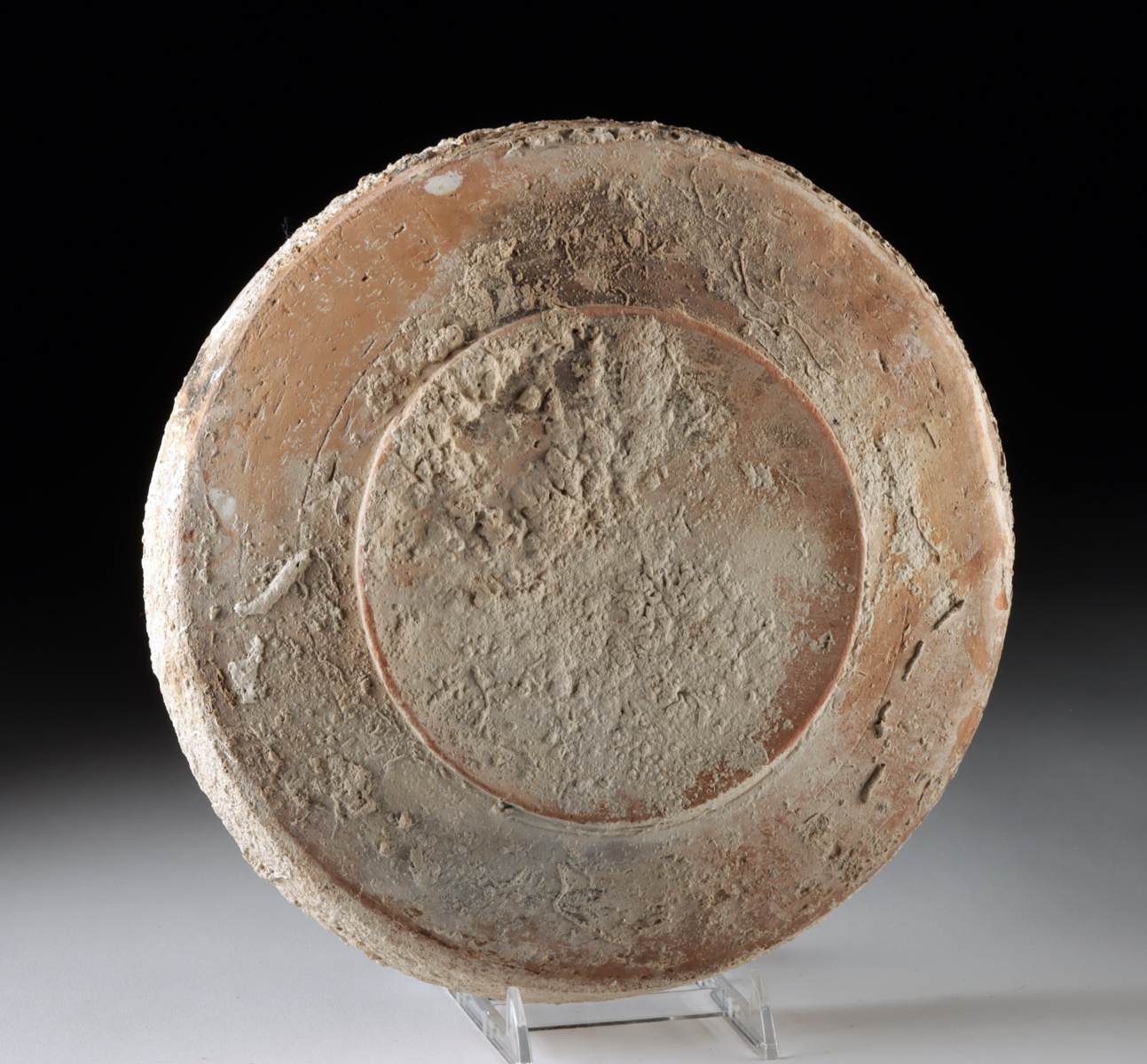 Eastern Mediterranean, Byzantine Empire, ca. 12th century CE. A Byzantine pottery bowl centered with an incised sgraffito image of a bird, surrounded by a field of repeating V-shaped motifs and a circular border of tongue pattern along the interior rim. The composition, though softened, remains legible, preserving the quiet elegance of medieval ceramic design. The surface is heavily encrusted with marine deposits, suggesting the vessel was lost at sea, where prolonged submersion altered its appearance. Much of the original glaze has worn away, with only scattered traces remaining, offering glimpses of its once-glossy finish beneath the mineral accretions. The shallow, open form and incised decoration align with sgraffito wares produced across the Byzantine world, vessels that balanced utility with ornament. Here, the effects of the marine environment add a second layer of history, marking the bowl’s passage through both human use and the sea. Size: 9.3″ Diameter x 2″ H (23.6 cm x 5.1 cm)