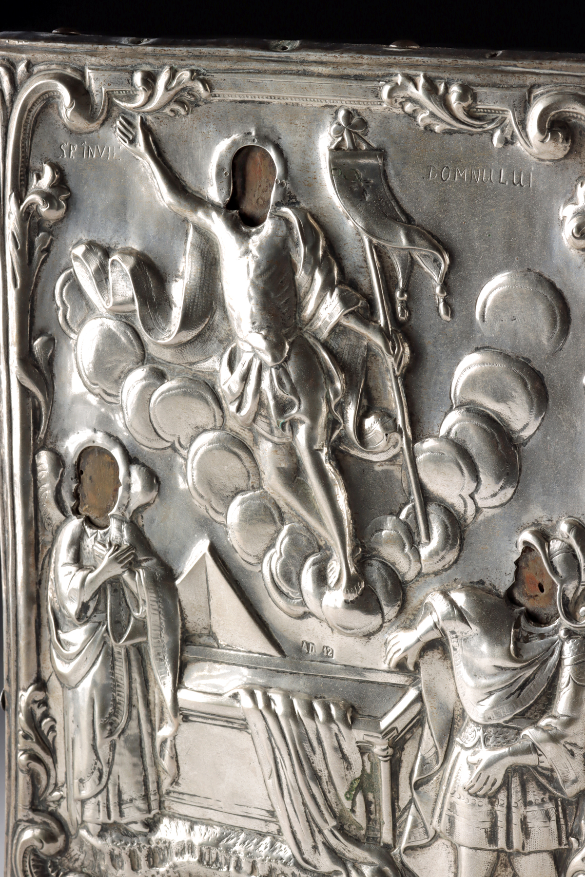 The sarcophagus at the center is draped with a finely chased cloth, and engraved upon its surface is a workshop hallmark reading “AD 12” – likely a silversmith’s internal code rather than a date. The upper inscription, “Sf. Invierea Domnului,” translates as “Holy Resurrection of the Lord,” clearly identifying the sacred theme. The silver oklad (or riza) is finely bordered with foliate scrollwork and architectural flourishes at the corners, typical of late 19th to early 20th century Romanian Orthodox metalwork. The chased silver is pierced to reveal the painted icon beneath, with visible openings for the faces and hands – a traditional Eastern Orthodox technique that honors both the painted image and its precious covering.