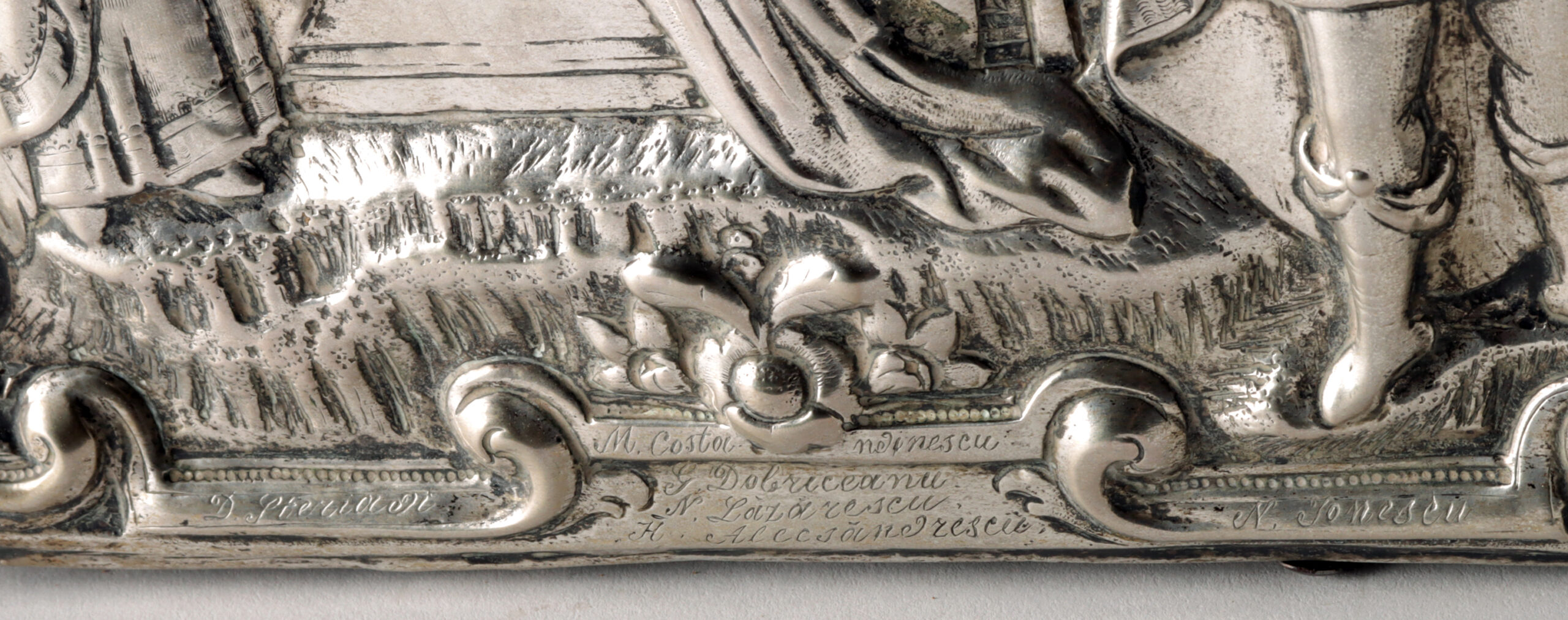 At the lower border, an engraved list of names in Romanian script memorializes the donors or patrons: M. Costandinescu, G. Dobriceanu, N. Lazarescu, H. Alexandrescu – a poignant testament to communal piety and ecclesiastical patronage. The verso features a dark wood panel reinforced with iron straps, displaying age and wear consistent with Orthodox devotional icons from the late 19th century. A compelling synthesis of religious devotion, national craftsmanship, and personal legacy, this icon would have originally adorned a church interior, chapel, or home altar, embodying the promise of resurrection and spiritual triumph.