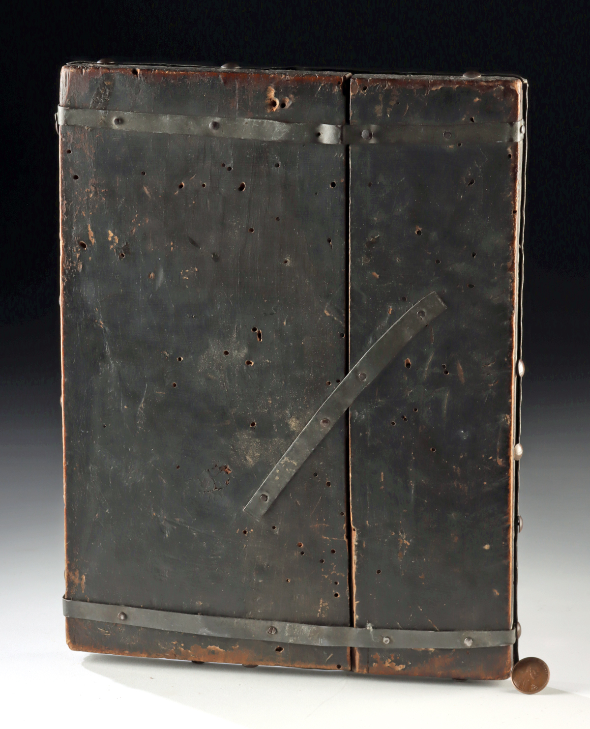 Condition: Old repairs to verso with iron bracing for support and losses to some of the original nails on the periphery, as well as painted detail. Surface wear commensurate with age, but otherwise, very nice presentation with good remaining repousse detail and rich patina to wood.