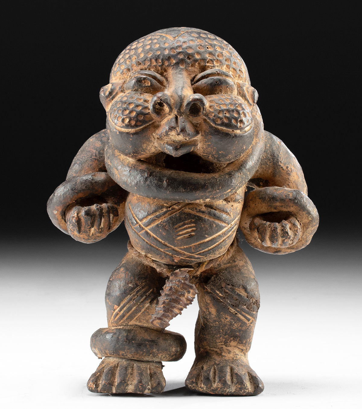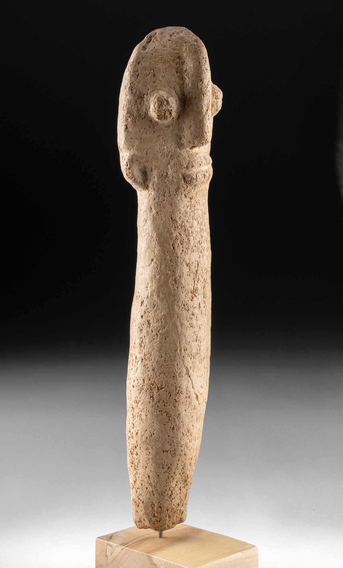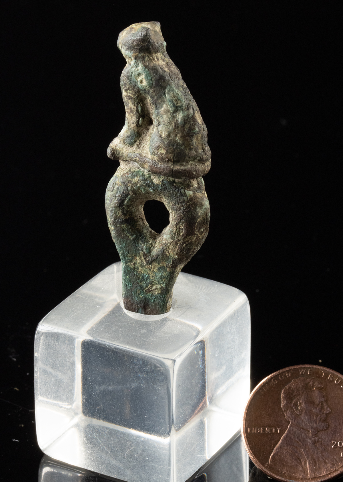 Condition: Softening to finer details. Pitting and abrasions to surface, with heavy patina and oxidation from age. Comes with a removable acrylic cube base.