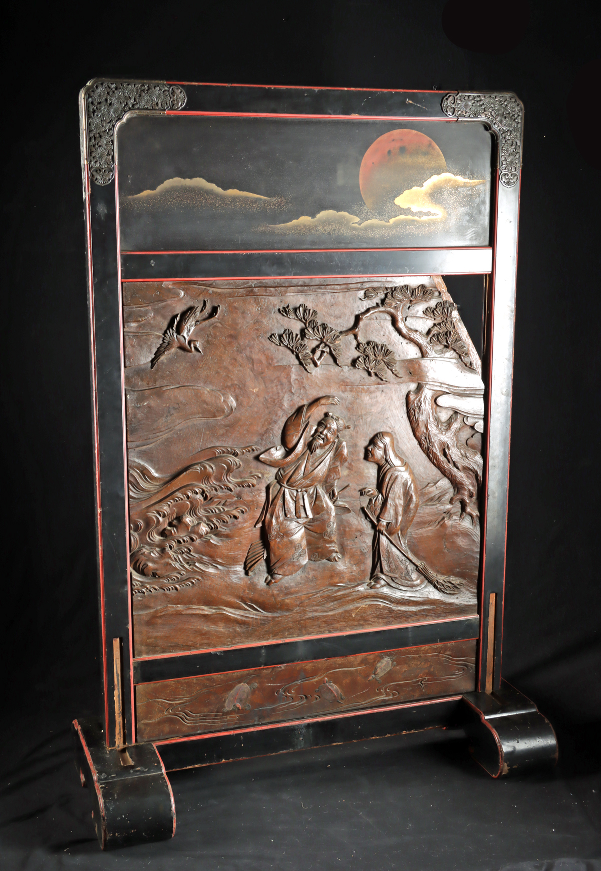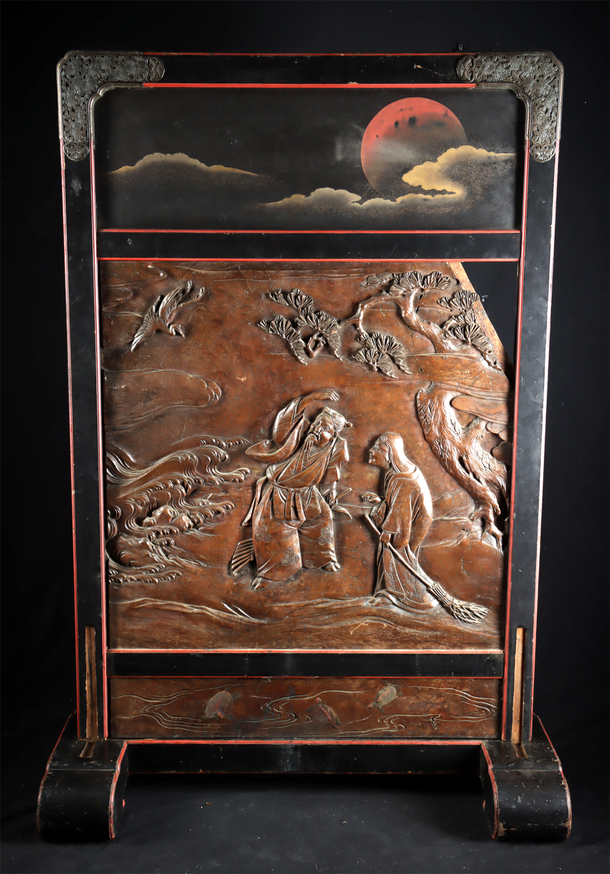East Asia, Japan, Meiji era, ca. 19th to early 20th century CE. A monumental carved wood screen set within a fitted frame and removable base, centered by a high-relief panel depicting the legendary Takasago couple, Jo and Uba, spirits of Japanese folklore who symbolize a long and harmonious marriage. The figures stand on a misty shore beneath a gnarled pine tree, holding a rake and broom, with a crane flying above the waves. The upper register is decorated with gilt clouds and a deep red moon against a dark ground, evoking a moonlit scene associated with the legend. The verso is carved with a blossoming cherry branch and a bird is depicted with remnants of nacre applique, while the lower panel shows bamboo leaves and pinecones with red and green applique accents and an incised signature. The upper corners are reinforced with decorative copper openwork brackets. Size: 47.5″ L x 20.5″ W x 69.5″ H (120.6 cm x 52.1 cm x 176.5 cm)