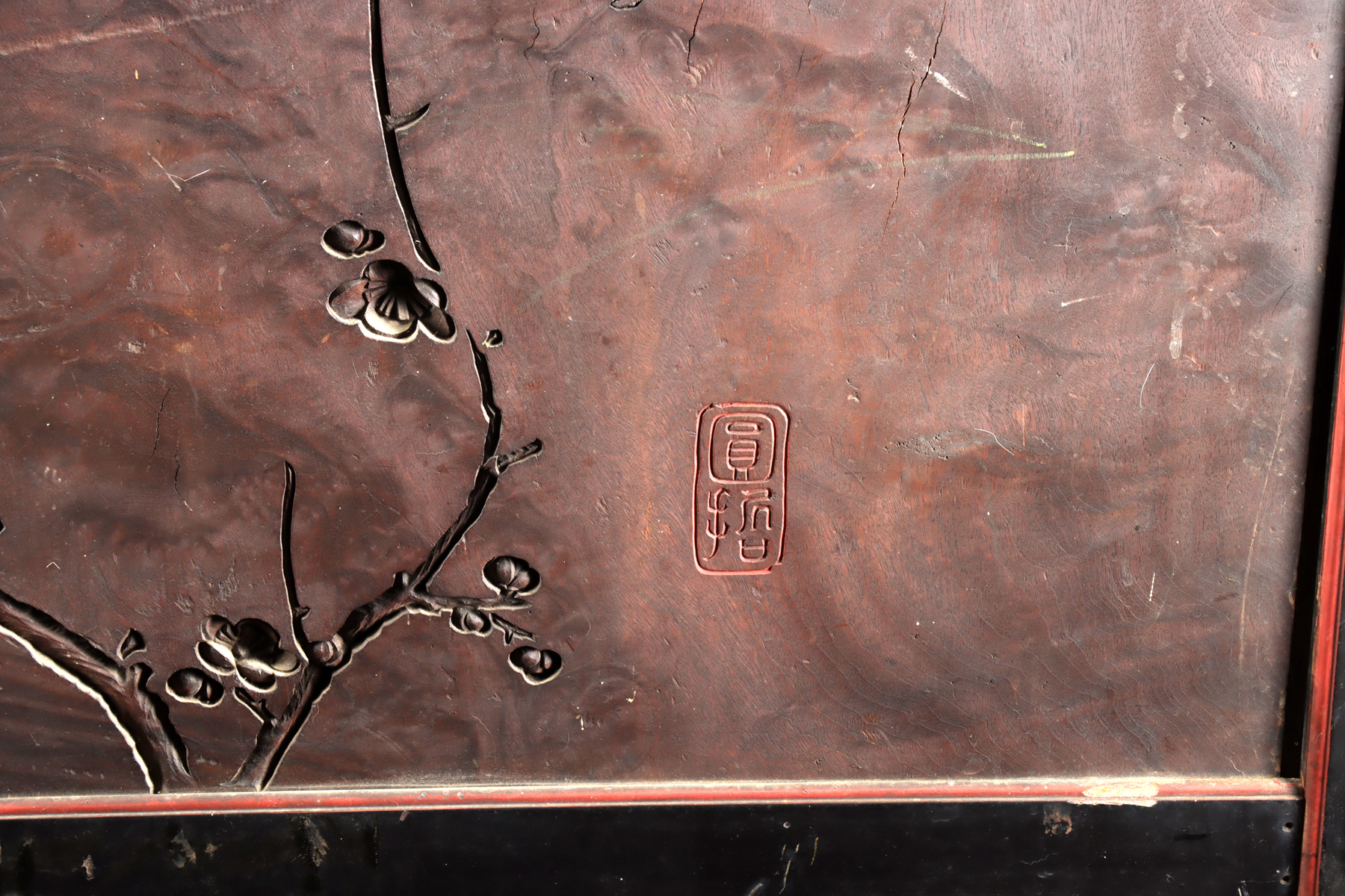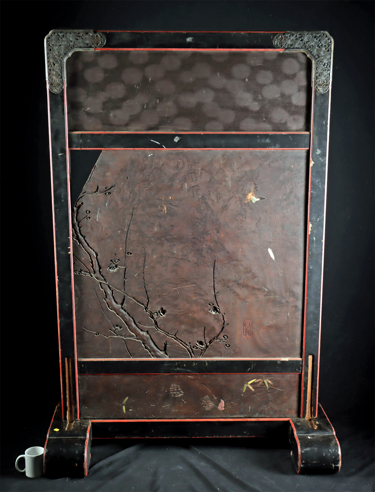 Condition: Scratches, and abrasions to the lacquer and carved wood consistent with age and handling. Areas of paint and lacquer loss, including scattered chips and small losses along edges and raised areas. Age cracks and wood shrinkage visible throughout, and the central carved panel is now removable due to shrinkage and has a large loss at one corner. The base has grooves likely from metal support brackets that are not missing. Losses to the applique and nacre panels on the bird and foliage on the verso. The screen remains stable and displays well.