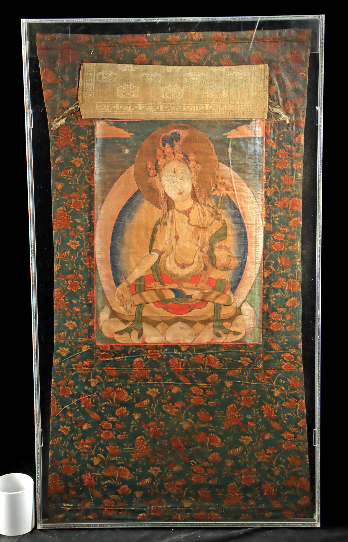 Central Asia, Tibet, ca. 19th to early 20th century CE. A canvas thangka painting of White Tara in a serene frontal pose, seated in full lotus position on a lotus throne and encircled by halo, with jewelry and a ornate coiffure. Her face has the third eye on her brow, and the iconography continues with additional eyes painted on her palms and the soles of her feet, emphasizing her all-seeing compassion and protection. The deity’s right hand lowers in a gift-bestowing gesture while her left hand holds a flowering lotus stem beside her shoulder. The painted canvas is set within a dark floral cotton or silk border and retains a woven upper sleeve that once housed a suspension dowel for hanging. Mounted in a clear modern acrylic case. Size of textile: 38″ L x 20″ W (96.5 cm x 50.8 cm); acrylic frame: 22.5″ L x 1.75″ W x 40″ H (57.2 cm x 4.4 cm x 101.6 cm)