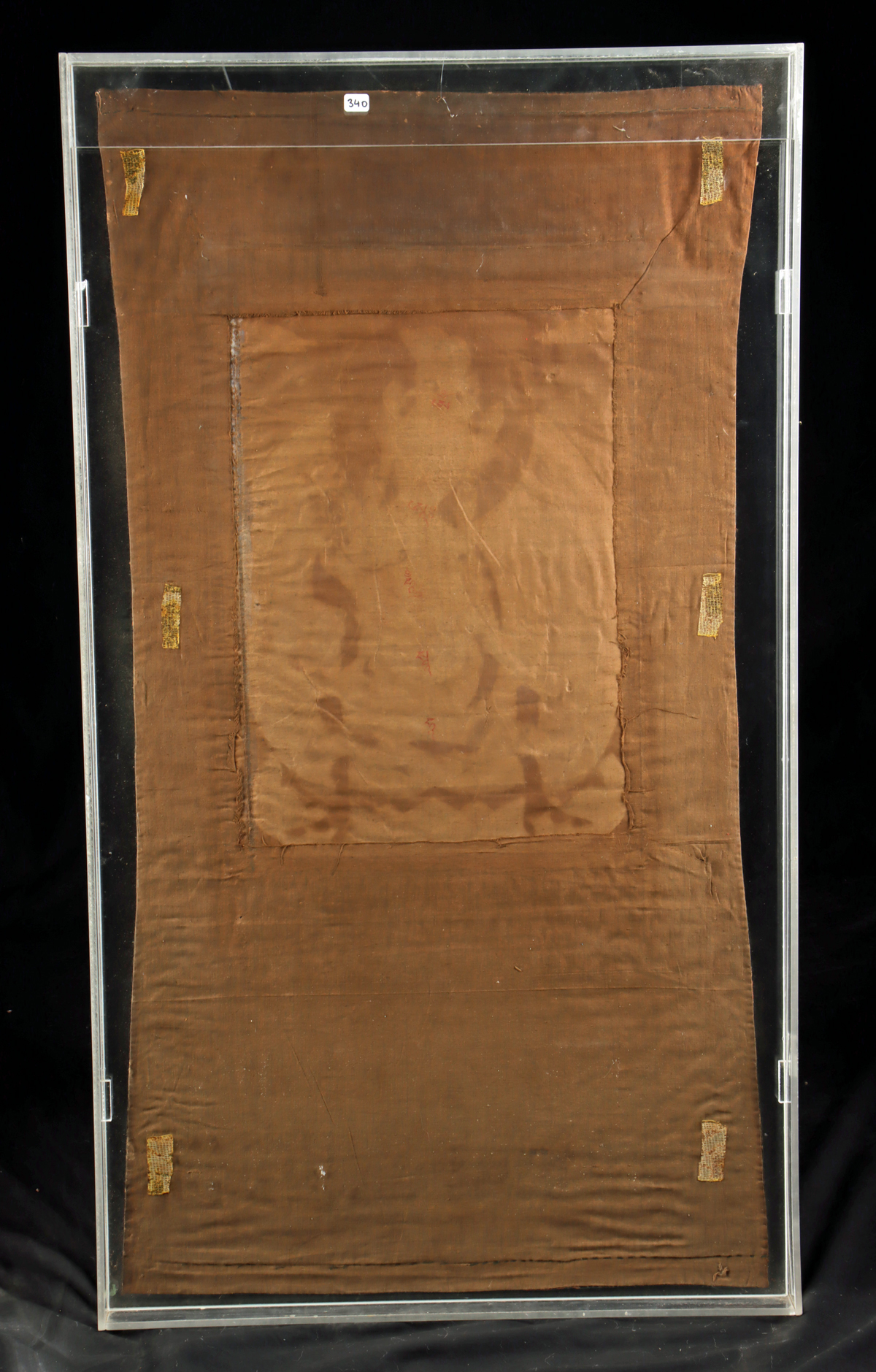 Condition: Staining and discoloration to the canvas with fading and wear to Tara’s face. Creasing to textile, and discoloration. Small old inactive insect holes to the sides of the printed textile. Mounted on an acrylic panel in an acrylic case and ready to display.