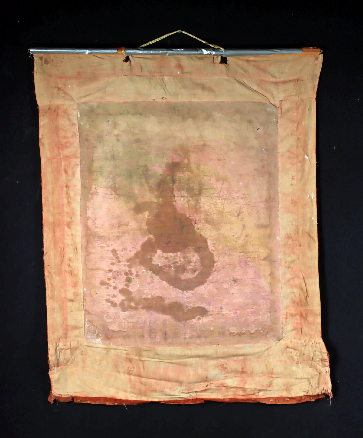 Condition: Adhered to dowel via foil tape. Repainted and retouched in areas; low levels (2-4%) of zinc and titanium detectable in white pigments. Tears, pulls, and losses to silk as shown, as well as creasing, chipping to pigments, staining, and discoloring in areas. Rich patina throughout. Good remains of imagery and liberal remains of detail. Suspension rope at top for display.