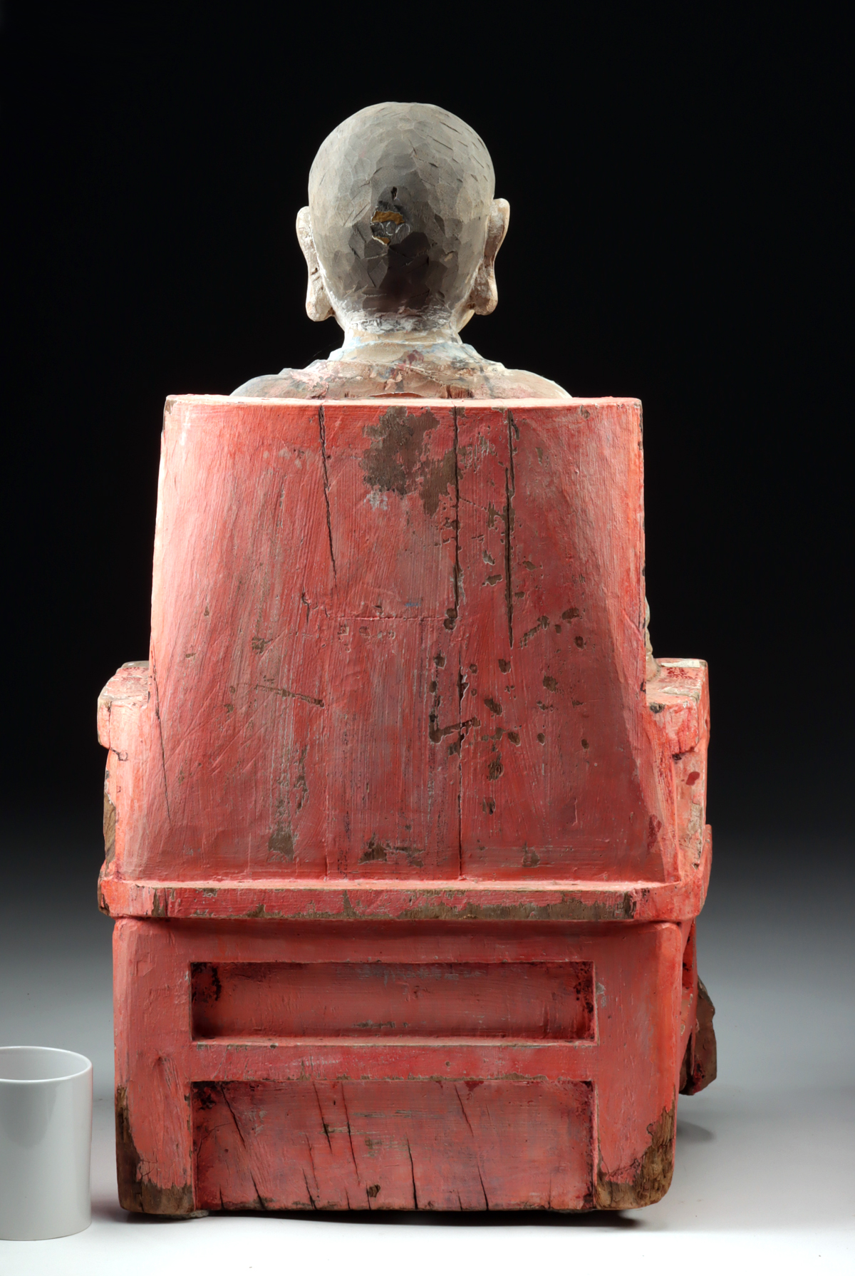 East Asia, China, late Ming to early Qing Dynasty, ca. 17th to 18th century CE. A solemn and sensitively rendered wooden sculpture of a lohan (also known as arhat), a venerable disciple of the Buddha, seated in dignified repose upon a red-lacquered chair. Carved with a commanding yet peaceful expression, the lohan holds his left hand in the shunya mudra – the “seal of patience” – a symbolic gesture associated with cultivating inner calm and transcending the ego. His right hand rests gently on his knee in a naturalistic pose. The figure is draped in a monastic robe that flows in sinuous folds, its surface retaining traces of black, blue, and ochre pigments that contrast beautifully with the bold red of the chair. The figure’s glass eyes, set within finely carved sockets, lend a lifelike sense of presence, intensifying the contemplative realism of his gaze. His shaved head, full cheeks, and slightly parted lips reflect the serene self-mastery of a spiritual elder. Size: 11.5″ L x 14.4″ W x 26″ H (29.2 cm x 36.6 cm x 66 cm)