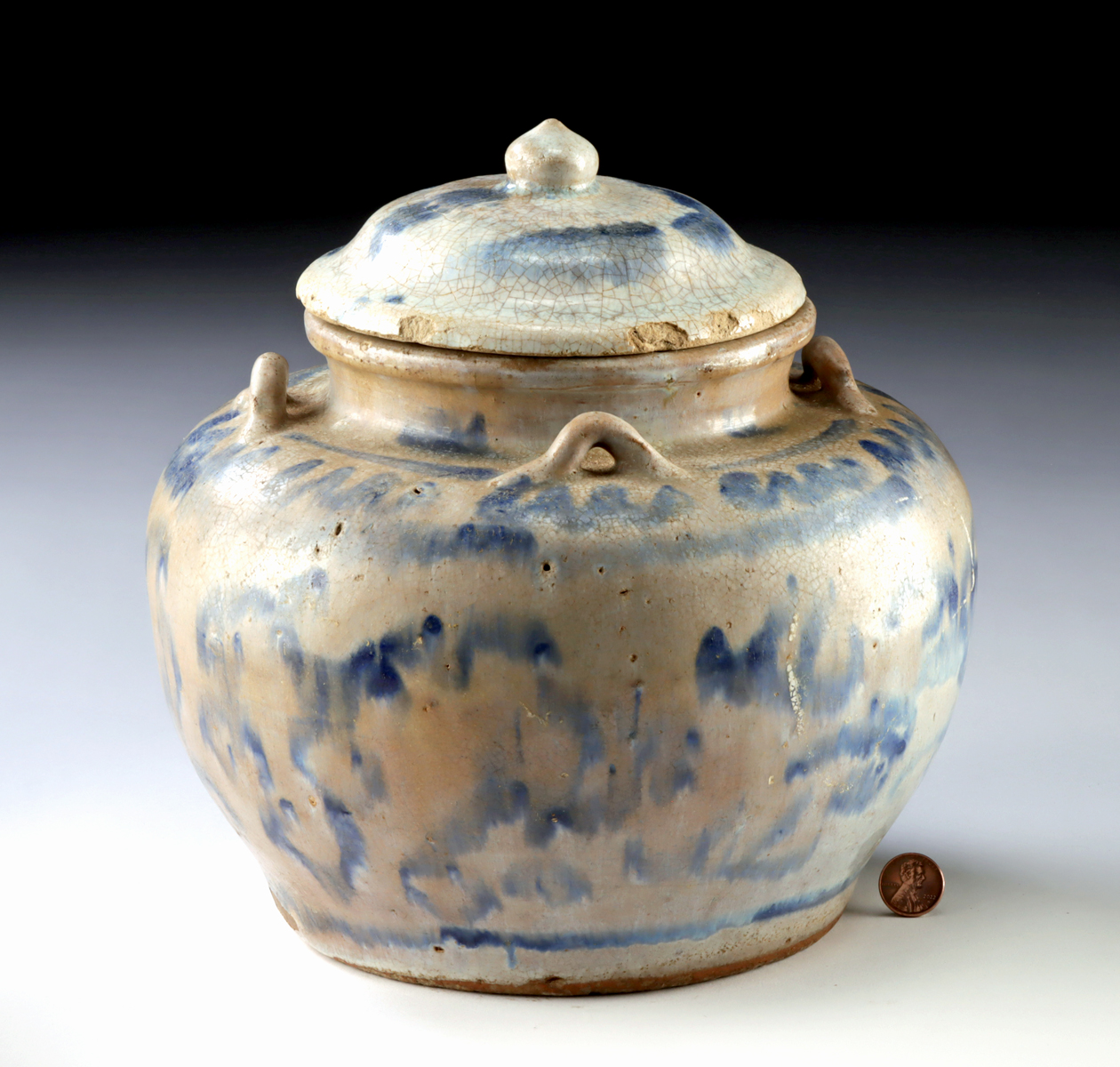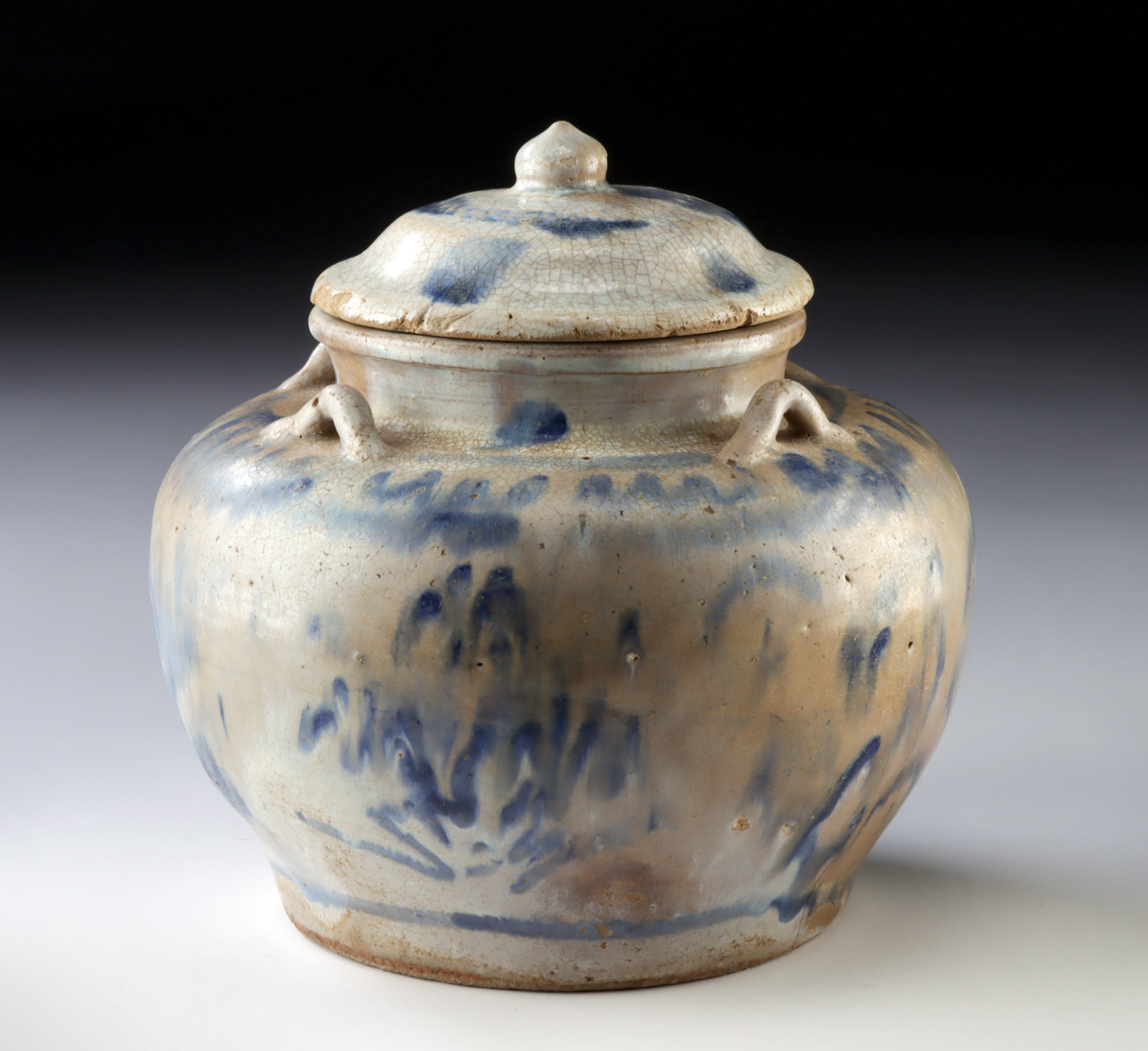East / Southeastern Asia, China, Qing dynasty, ca. 18th to 19th century CE. A blue-splashed export ware ginger or wine jar with a softly rounded body and lid. The pale glaze is animated by fluid cobalt washes that pool and feather across the surface. The shoulder is set with four small strap handles. Pieces of this type were widely traded from the southeastern mainland to the Philippines and likely continued along the Acapulco trade route. The form and decoration reflect the adaptability of Chinese kilns to overseas markets and taste. Size: 8.5″ W x 9.5″ H (21.6 cm x 24.1 cm)