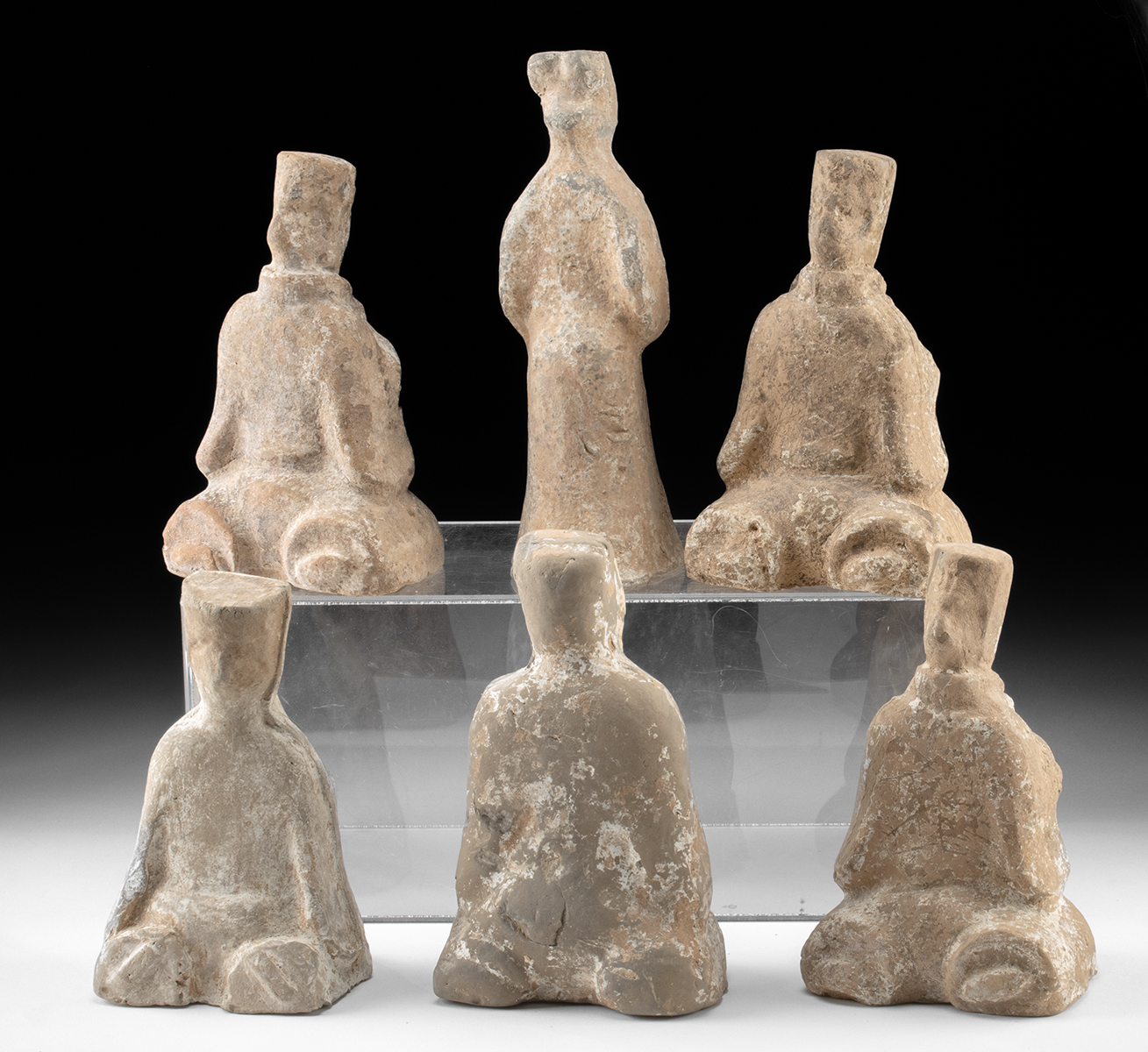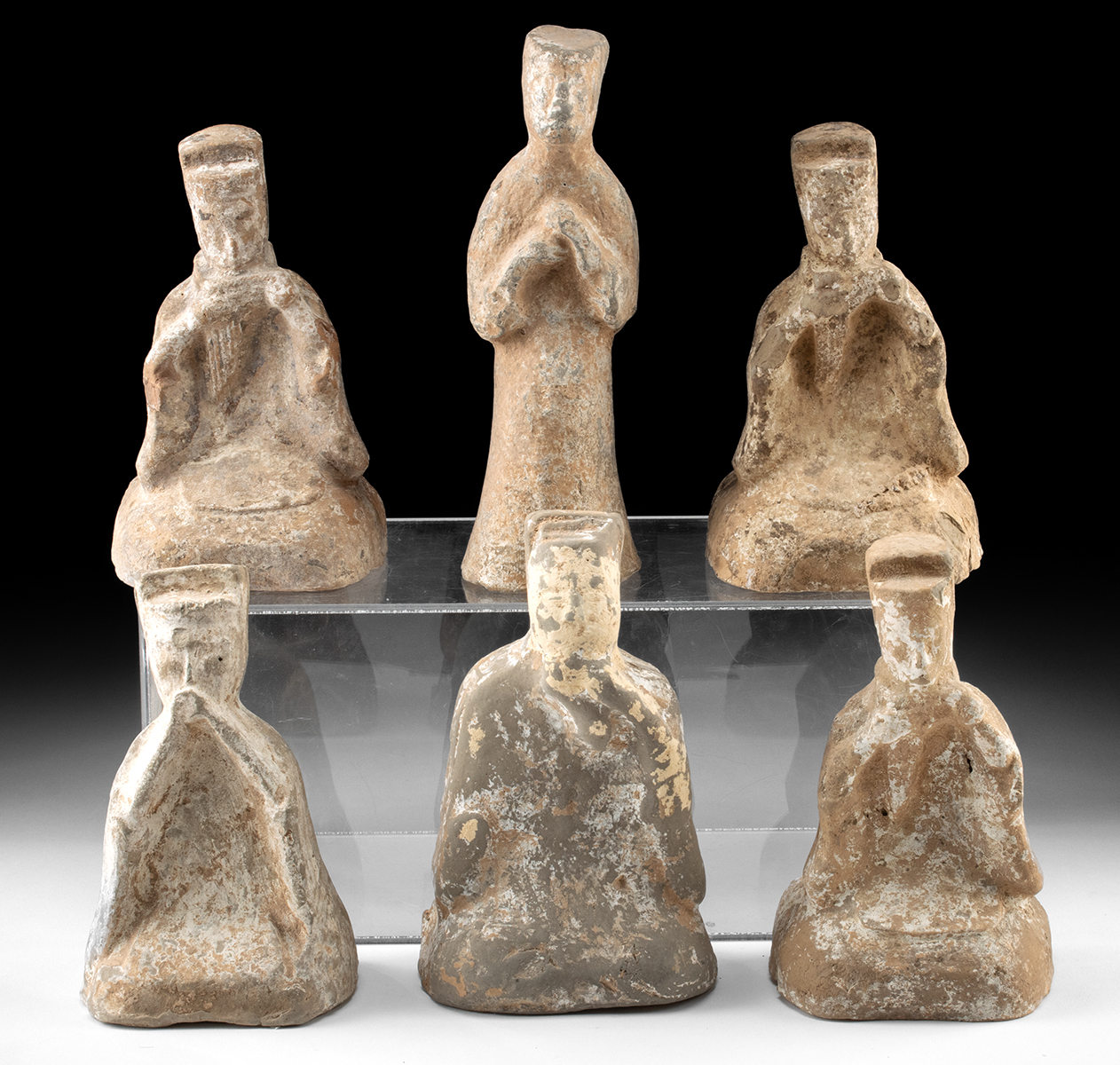 East Asia, China, Han Dynasty, ca. 206 BCE to 220 CE. A remarkable ensemble of six Han Dynasty ceramic tomb attendants, beautifully representing the harmony of music and movement in the ancient afterlife. The group comprises five seated male musicians and one standing female dancer, each rendered with a quiet dignity and a gentle sense of realism. The musicians are shown in performance, their gestures captured mid-action – one kneeling and playing a flute, while the remaining four hold pipes close to their chests. Their faces are softened by time, yet their postures retain the poise of courtly ritual. At the center stands the dancer, her graceful form cloaked in a long robe with sleeves drawn forward in a gesture of movement, suggesting a performance of reverence or celebration before the departed spirit. Each figure wears a tall, rounded hat and a thick-collared robe, their garments modeled with subtle folds and natural drapery. Size of largest (dancer): 3″ L x 2.7″ W x 8.1″ H (7.6 cm x 6.9 cm x 20.6 cm)