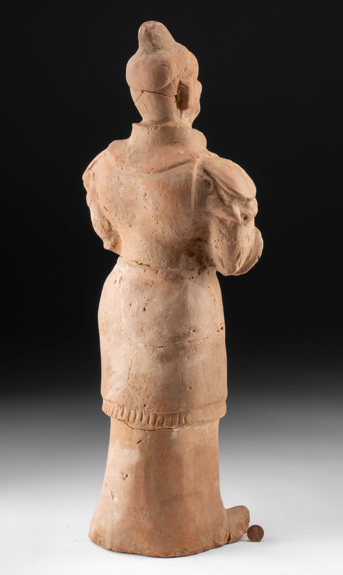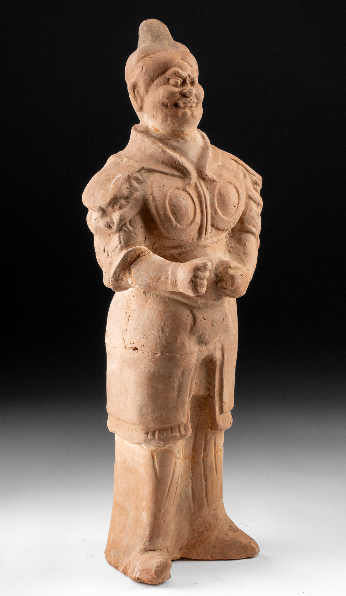 East Asia, China, Northern Wei to early Tang Dynasty, ca. 5th to 7th century CE. A commanding terracotta guardian figure, this imposing sculpture once stood sentinel within a Chinese tomb, its stern gaze and armored presence intended to repel malevolent forces in the afterlife. Modeled in earthenware and now presenting in buffware, the figure was originally vividly painted, its polychrome surface animating the armor, garments, and facial features within the dim interior of a burial chamber. Constructed in sections, it stands upright on sturdy, booted feet, its proportions elongated in keeping with sculptural conventions of the Northern Wei and early Tang periods. The torso is clad in stylized armor, marked by circular breast medallions and pronounced shoulder guards, while the arms bend forward at the elbows, hands clenched as if once grasping now-lost attributes or weapons. The garment falls in simple, columnar folds below the waist, terminating above firmly planted feet that anchor the figure with quiet authority. Size: 8.2″ W x 22.1″ H (20.8 cm x 56.1 cm)