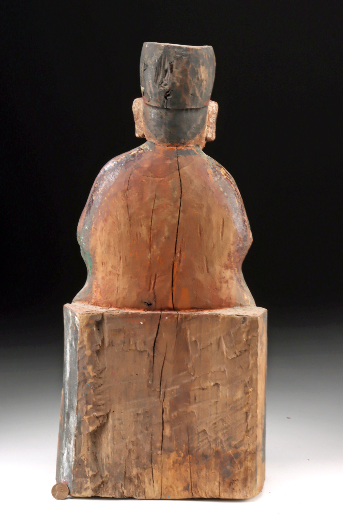 East Asia, China, Qing Dynasty, ca. 18th century CE. An impressive hand-carved wooden figure of the Chinese God of Wealth, richly polychromed and dating to the Qing Dynasty, shown seated in full ceremonial robes atop an integral pedestal base. Carved from a single block of wood, this devotional sculpture was likely intended for a home or temple altar, serving as an object of veneration and a conduit for attracting prosperity. The god is depicted in a formal pose, his voluminous garments cascading in deeply incised folds, with his hands concealed within layered sleeves as he clasps a prominent wealth bag – a symbol of abundance, good fortune, and protection. The figure’s face is expressive and dignified, featuring full cheeks, a strong brow, and a neatly rendered moustache that lends him an air of wisdom and solemn authority. He wears a traditional high official’s cap, signifying status and reverence, while remnants of red, green, yellow, white, and black pigments remain across the surface – a testament to the statue’s once vibrant and colorful presentation. Size: 8.8″ L x 5.5″ W x 19″ H (22.4 cm x 14 cm x 48.3 cm)