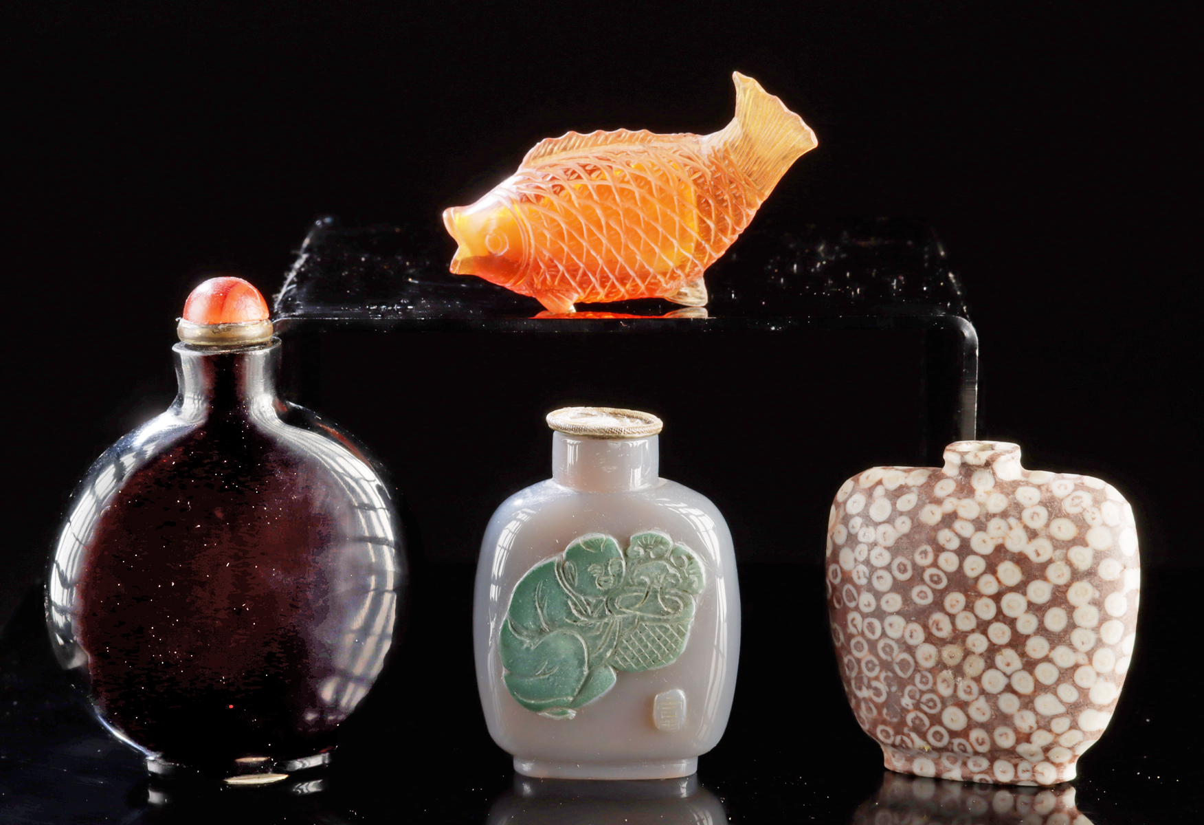 Together, these four bottles offer a concise yet richly varied portrait of Qing snuff bottle production, where precious and humble materials, symbolism and sensation, seriousness and delight coexist in objects meant to be held close, admired, and quietly enjoyed.
