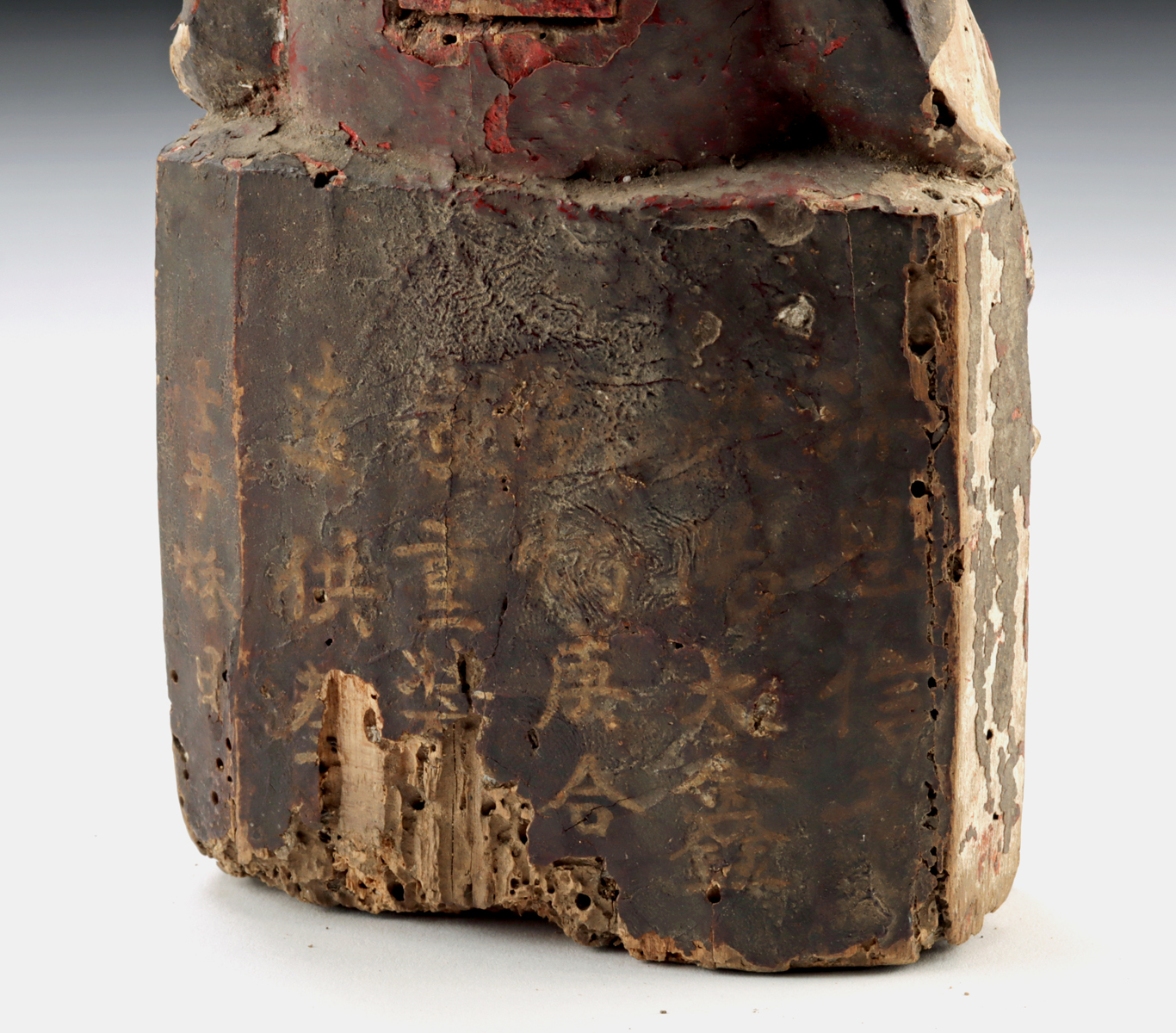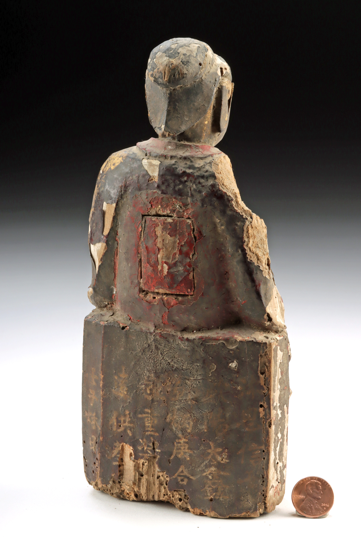 Condition: Loss to proper right shoulder. Some areas of old, inactive insect damage, as well as nicks, chips, and abrasions as shown, all commensurate with age. Liberal remains of gilding and pigment with