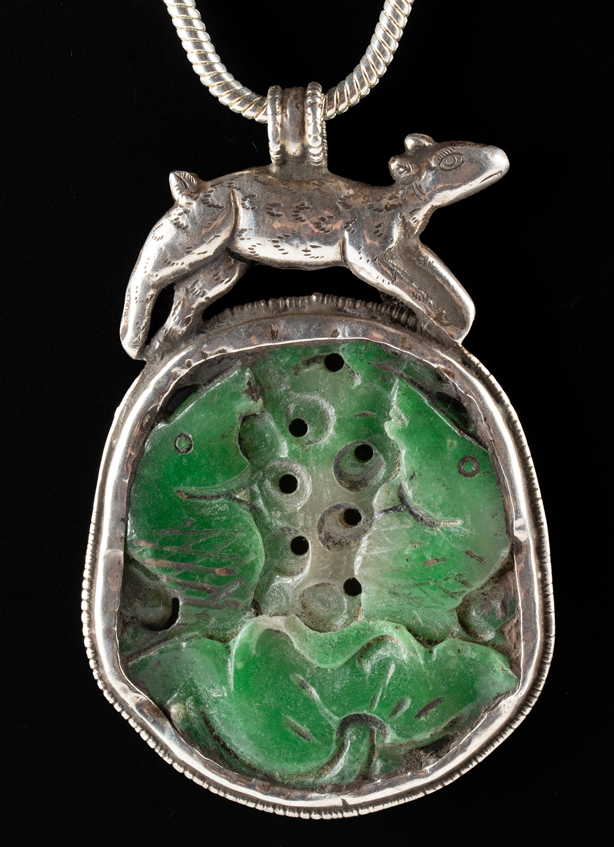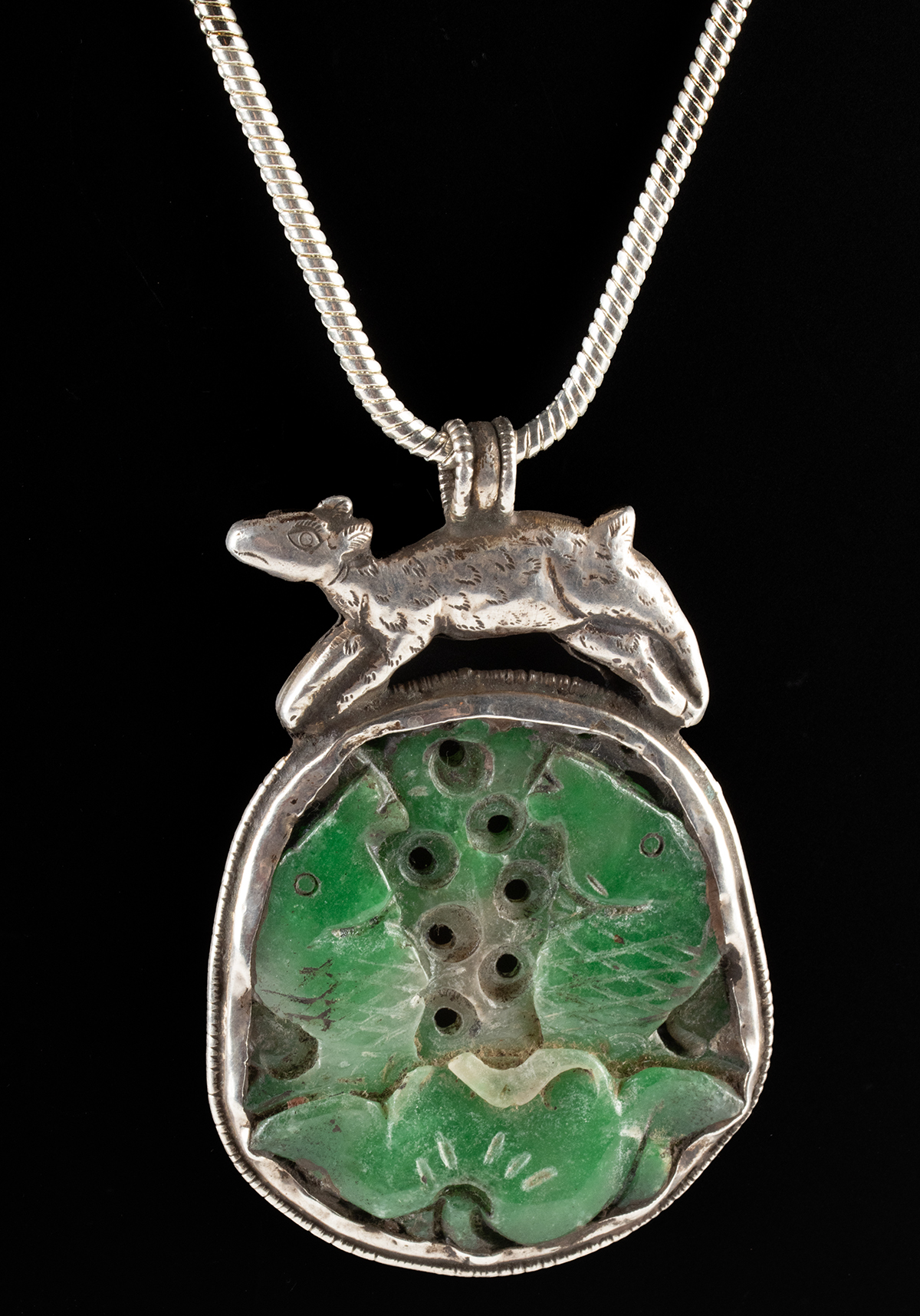 East Asia, China / Tibet, ca. early to mid-20th century CE. A sterling silver pendant set with a carved green stone plaque depicting the Buddhist auspicious pair of fish rising from a lotus in low relief, enclosed within a closely fitted silver bezel and crowned by a goat or deer in motion. Suspended from a modern brass chain and wearable. Size of pendant: 3.25″ L x 2″ W (8.3 cm x 5.1 cm); silver quality: 97%; weight: 48 grams; chain: 18″ L (45.7 cm)