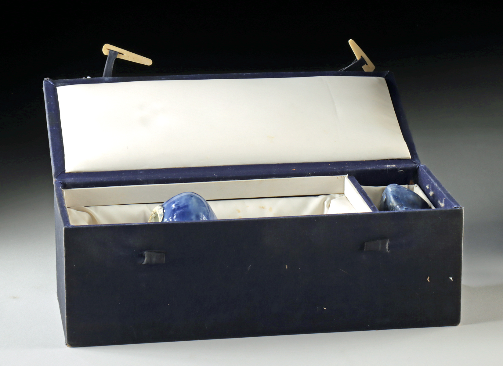 Blue-glazed porcelain was a distinctive and technically challenging innovation within the broader Joseon ceramic tradition, valued for its subtle play of light and texture. Together, these vessels embody the era’s harmony between utility and artistry – functional yet deeply poetic expressions of the Korean spirit. Housed in a fitted silk-lined presentation box, the pair represents not only the enduring refinement of Joseon craftsmanship but also the quiet beauty of the scholar’s pursuit of harmony and contemplation.
