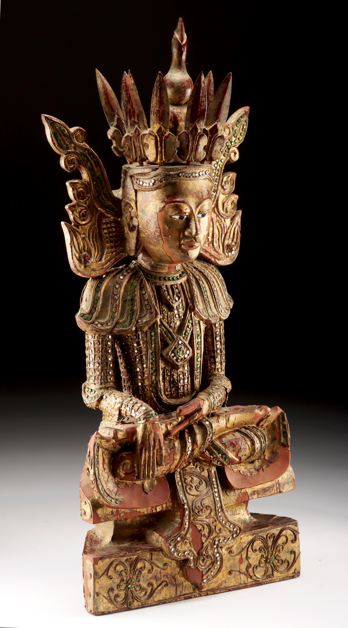 This example would likely have occupied a temple shrine or private devotional space, where the gleaming glass inlays caught the flicker of candlelight, amplifying the aura of sanctity. The delicate tracery of floral and geometric motifs across the robes and base exemplifies the refinement of late Konbaung-era craftsmanship, a fusion of opulent court style and spiritual iconography.