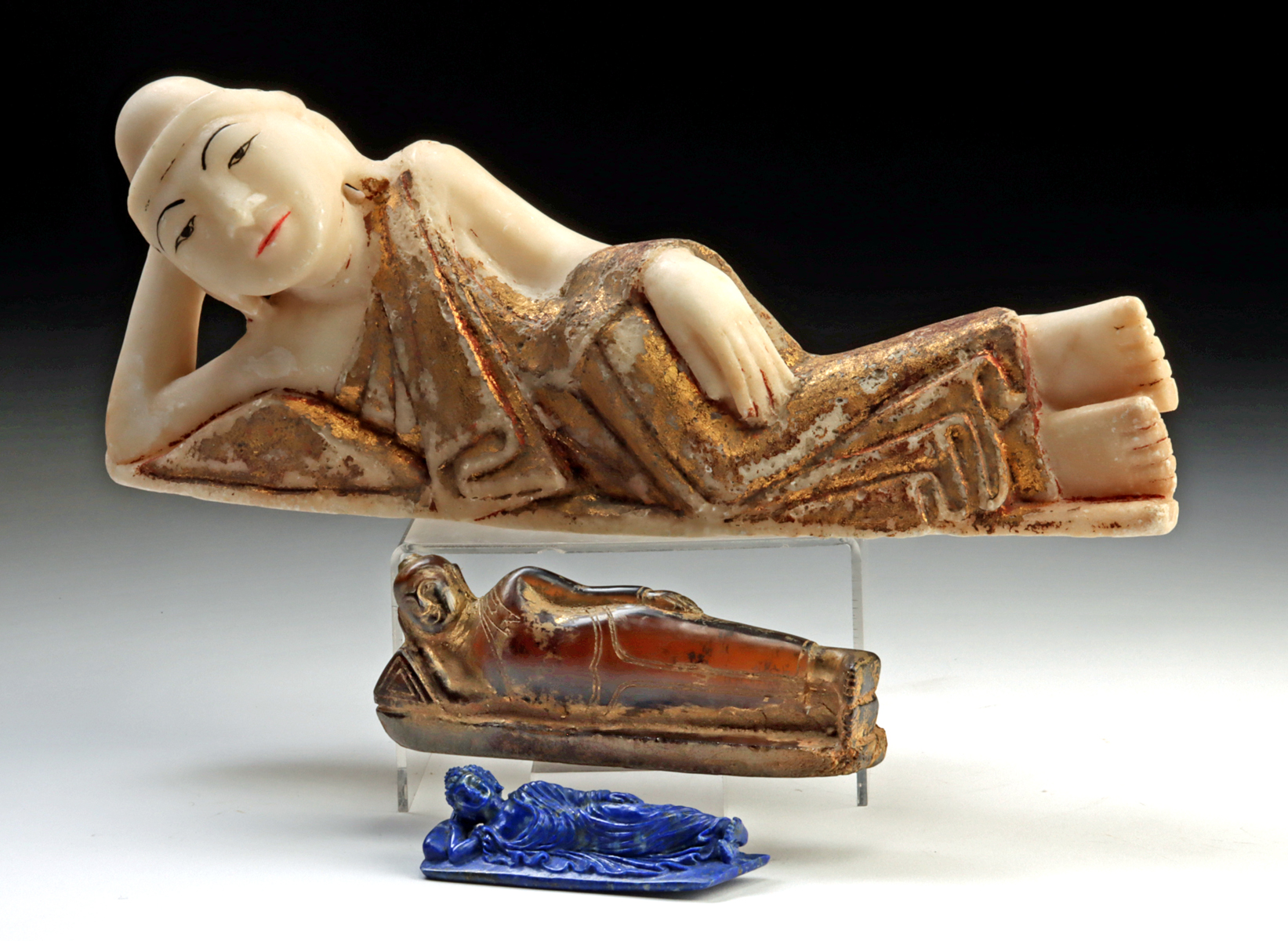 Southeast Asia, Burma (Myanmar), ca. 19th and middle of 20th century CE. Comprising a group of three reclining Buddha images, including: a carved white marble figure with painted facial features and traces of gilt decoration; a dark glass example with parcel-gilt surface; and a small lapis lazuli reclining figure.